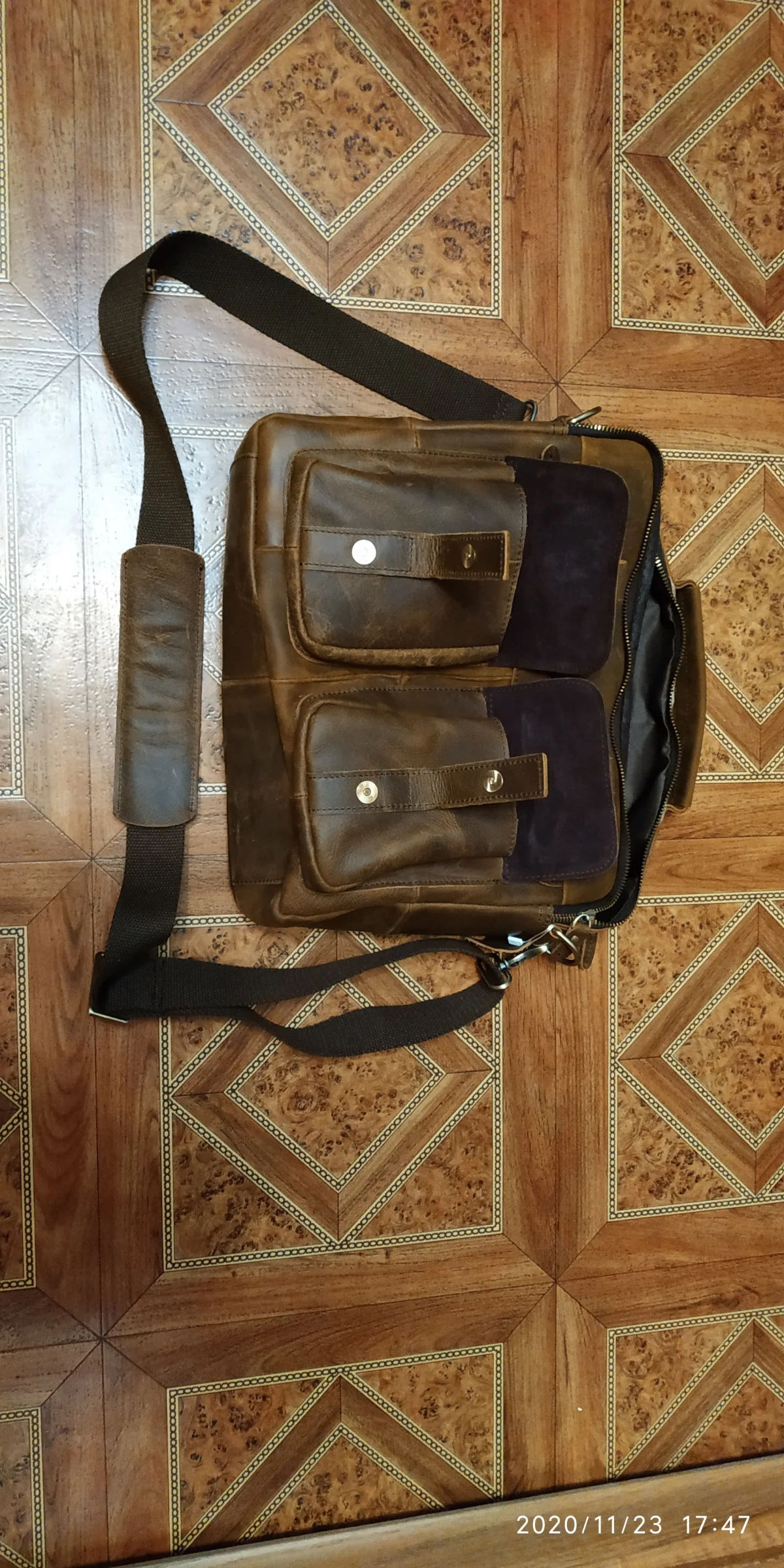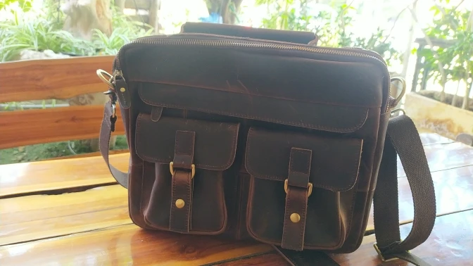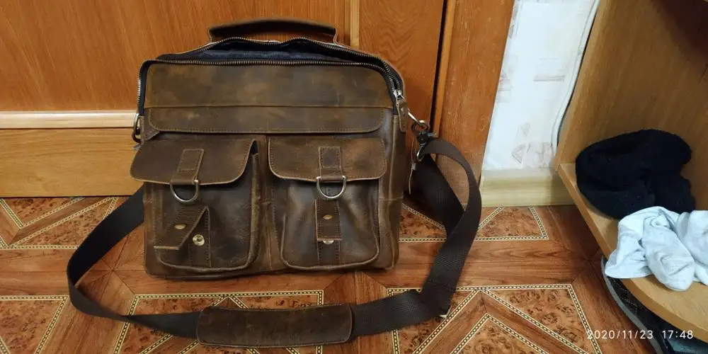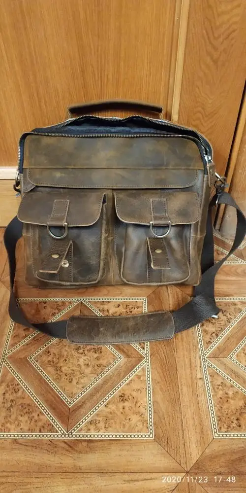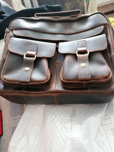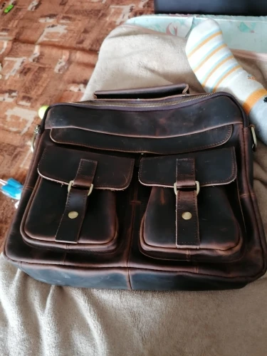 Сумка отличная. Признаюсь: удивили! Доставка месяц. Но сама сумка отличного качества. Материал, цвет, прошито и качество исполнения на высоте. Да это кожа. Правда разные части сумки сделаны из разной по толщине кожи, но действительно кожа. И такая грубая, что сумка даже пустая стоит и держит форму! Из недостатков: немного замок мешает закрыть петля. И если бы сделали сумку прям на 2 сантиметра побольше, цены бы ей не было. Покупал для документов, но папка входит почти впритык. Зато не болтается внутри. Но доставать бы было удобнее, если бы сумка была на 2 см больше. Это единственный минус, но предполагал, что так будет, не хотел большую. Немного есть запах, но не противны и не вонючая и не такой уж сильный. И если осознать что это кожа, то так пахнет любая кожанная вещь.. А так, респект продавцу за такой товар. Приятно удивили и порадовали.