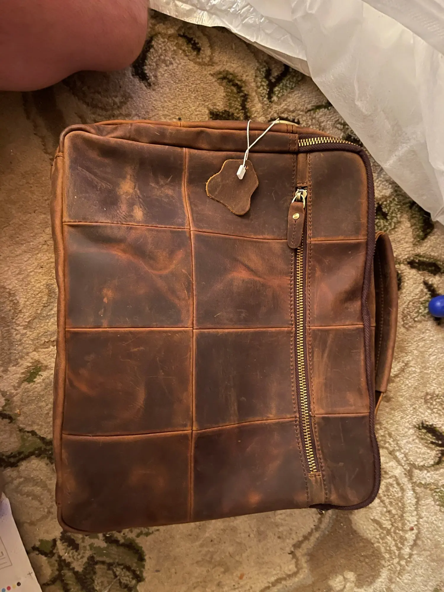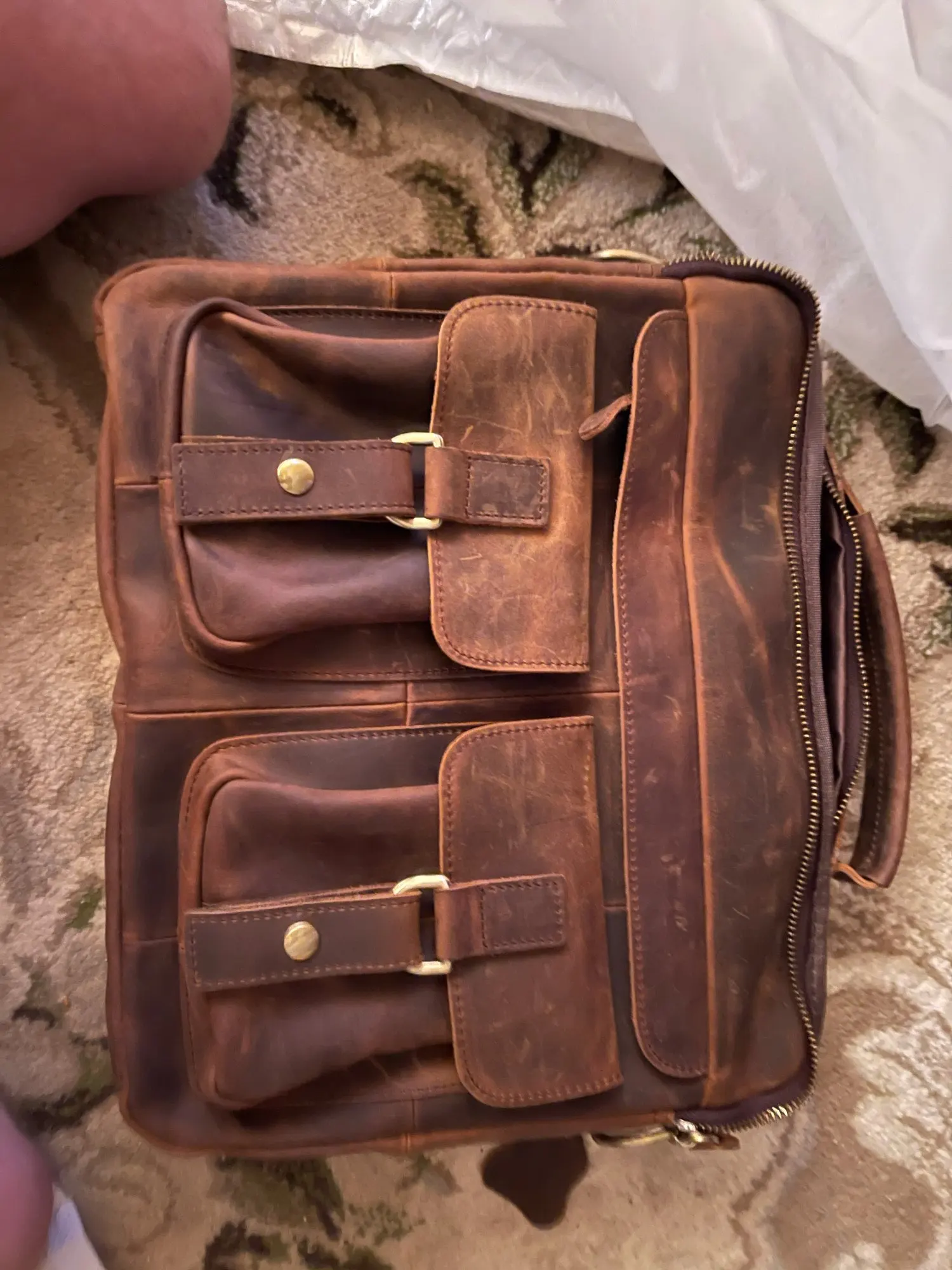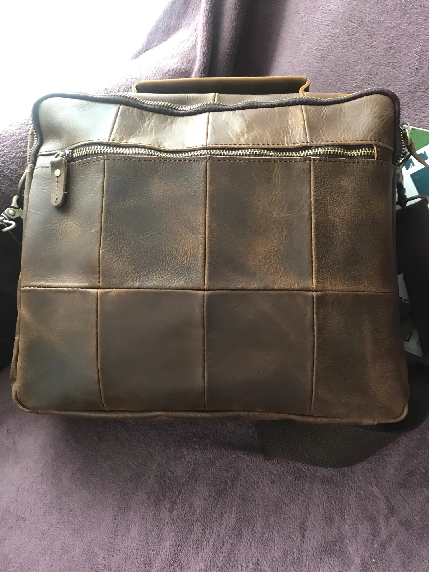 Сумка отличная. Признаюсь: удивили! Доставка месяц. Но сама сумка отличного качества. Материал, цвет, прошито и качество исполнения на высоте. Да это кожа. Правда разные части сумки сделаны из разной по толщине кожи, но действительно кожа. И такая грубая, что сумка даже пустая стоит и держит форму! Из недостатков: немного замок мешает закрыть петля. И если бы сделали сумку прям на 2 сантиметра побольше, цены бы ей не было. Покупал для документов, но папка входит почти впритык. Зато не болтается внутри. Но доставать бы было удобнее, если бы сумка была на 2 см больше. Это единственный минус, но предполагал, что так будет, не хотел большую. Немного есть запах, но не противны и не вонючая и не такой уж сильный. И если осознать что это кожа, то так пахнет любая кожанная вещь.. А так, респект продавцу за такой товар. Приятно удивили и порадовали.