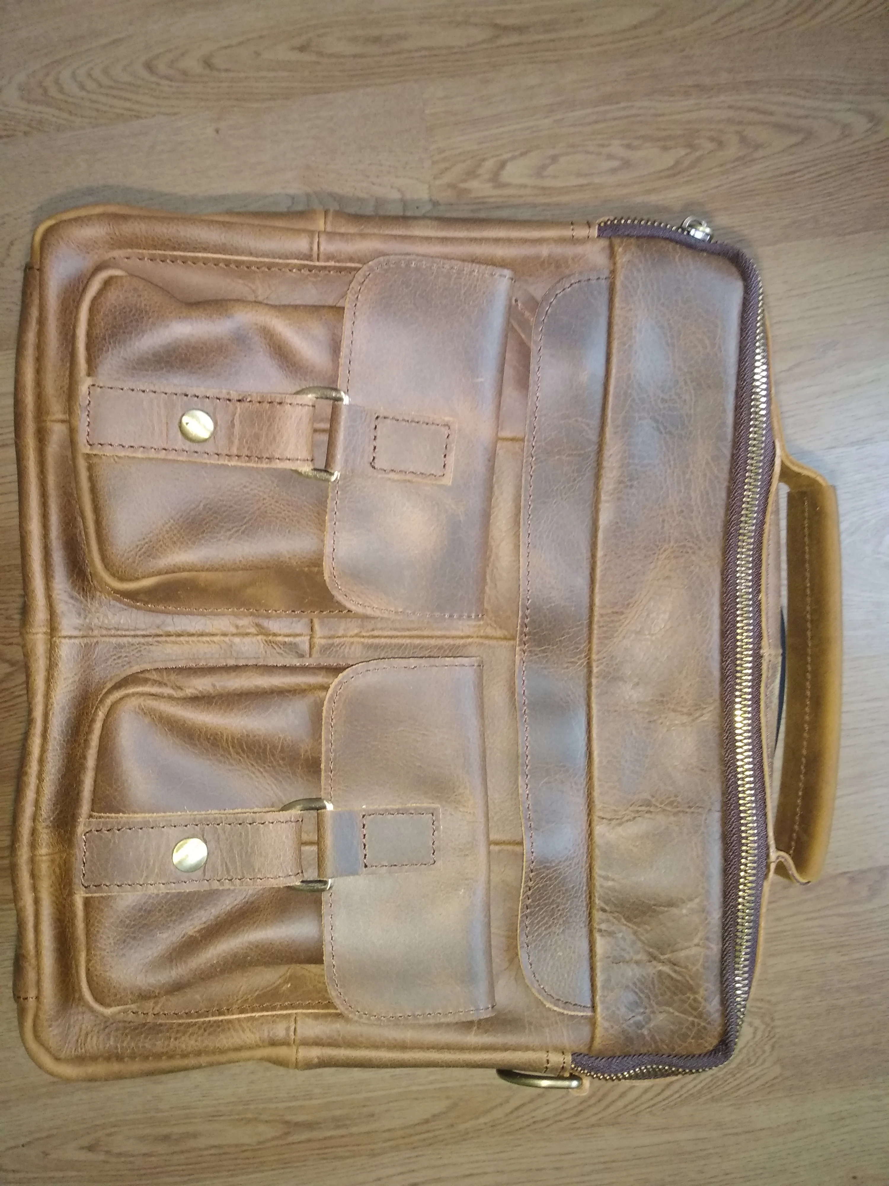 Сумка полностью кожаная, кожа толстая, качественная. Фурнитура очень хорошая. Выглядит не дёшево, кажется маленькой, хотя вмещает формат А4, специально папку рядом положила. Не нравится цвет молний-слишком золотой, и то, что бока и задняя стенка из кусочков. Сочетание цена-качество не разочаровало. 2 отделения, ручка по центру и 7 карманов. Пришла за 5 недель.