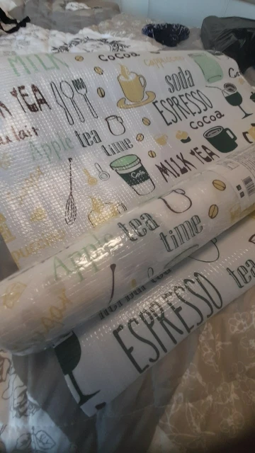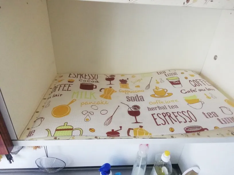 на ощупь неплохой коврик для шкафов. как будет на практике пока не знаю. положила пару шкафчиков.. жаль что я их раньше на AliExpress не видела. покупала в магазине. вот на два шкафа не хватило и тут их увидела и заказала. расцветка приятная. пришла на почту ту-ту я ещё из почты 2-3 дня забирала никак не могла сходить.
