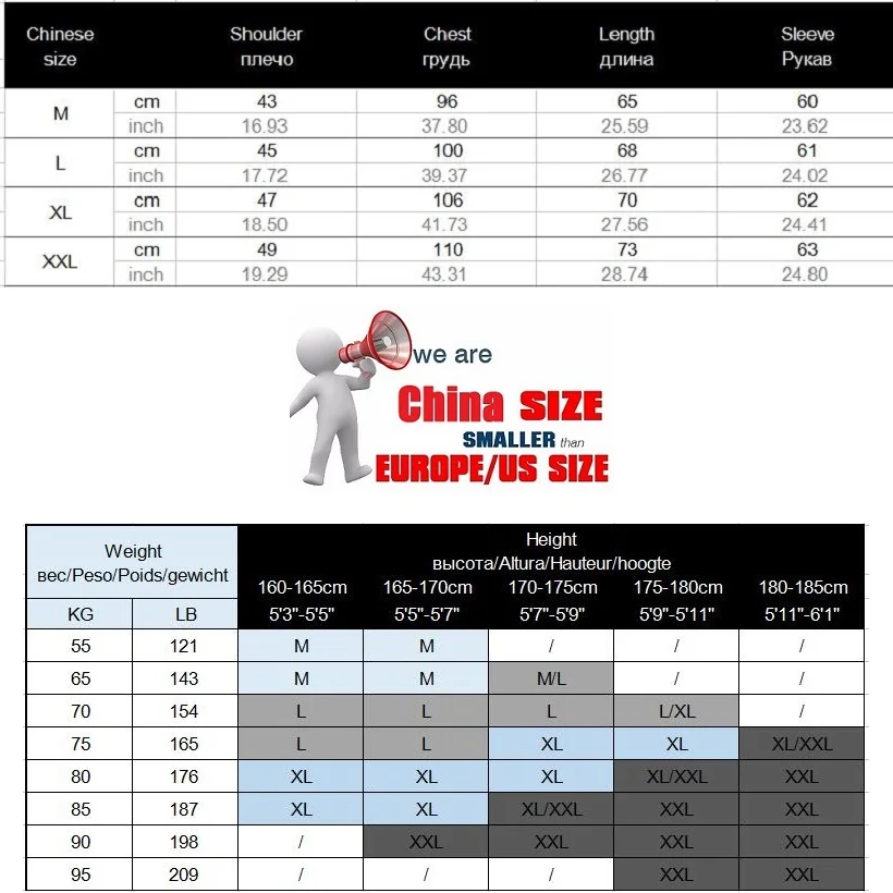 Указанные выше размеры подходят для большинства людей, но они не являются абсолютными. Если вы хотите размер, который вам подходит лучше всего, Пожалуйста, измерьте грудь, плечо и рукава рубашек, которые вы обычно носите, а затем сравните наши данные о размерах. Для выбора.