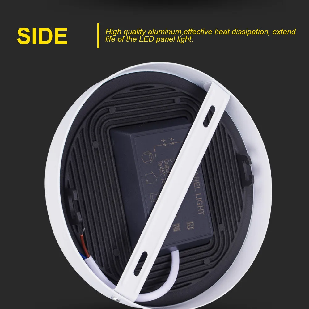 Ультра Поверхностная панель света с черным тепловым радиаторомМатериал:Литье под давлением алюминия, PS LGP, круглой или квадратной формы.Источник света:4014SMD 0,2 W RA>70 24-26LMИсточник питания:Ультра тонкая изоляция PF> 0,5,Напряжение: 85-265 в