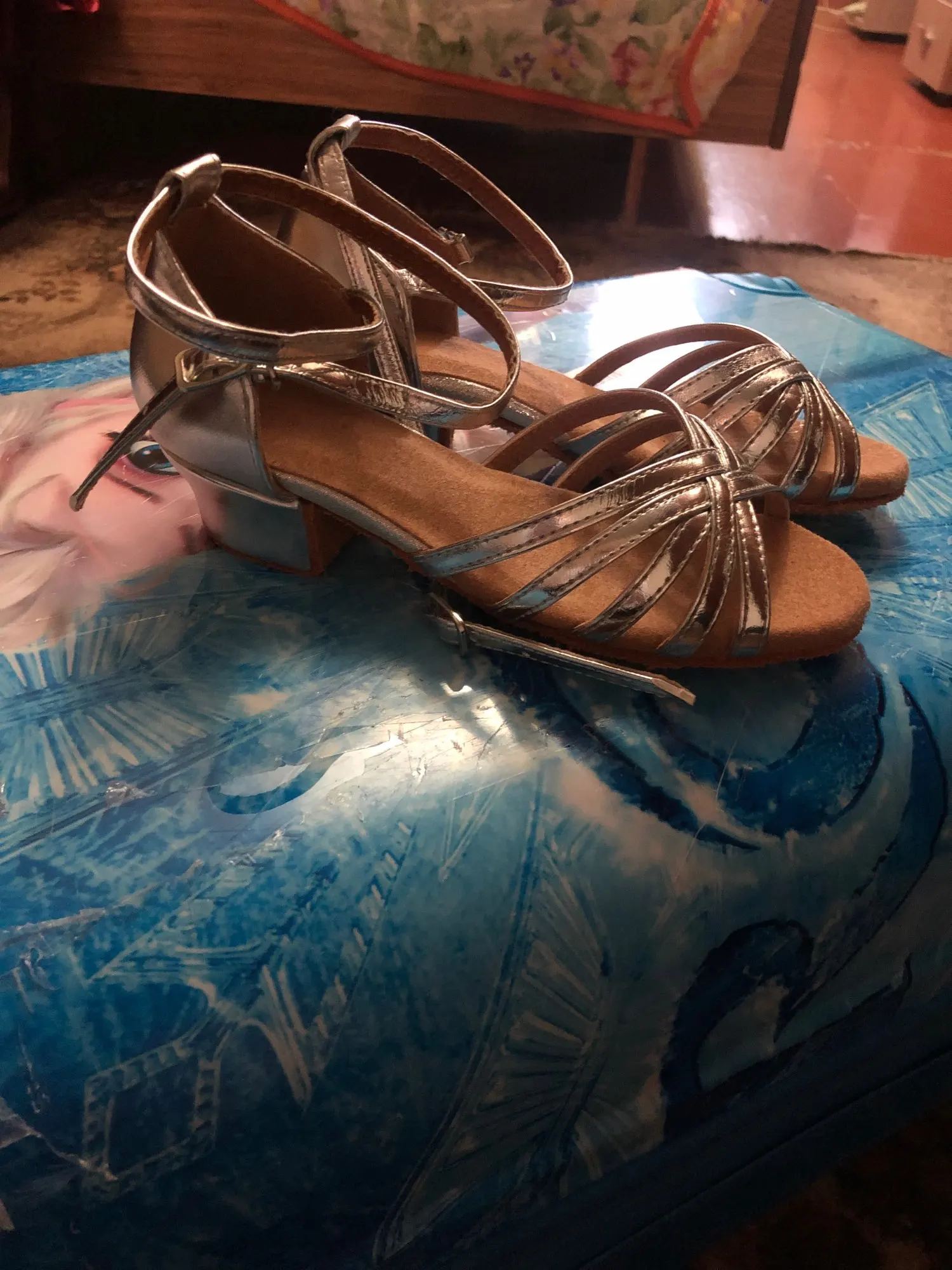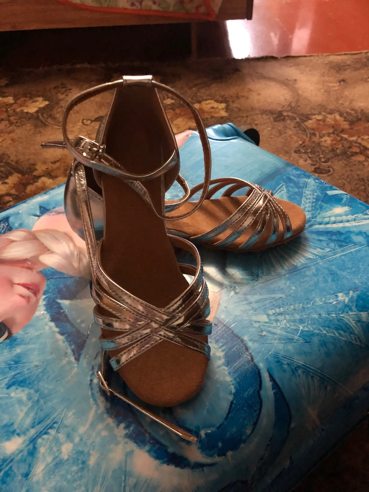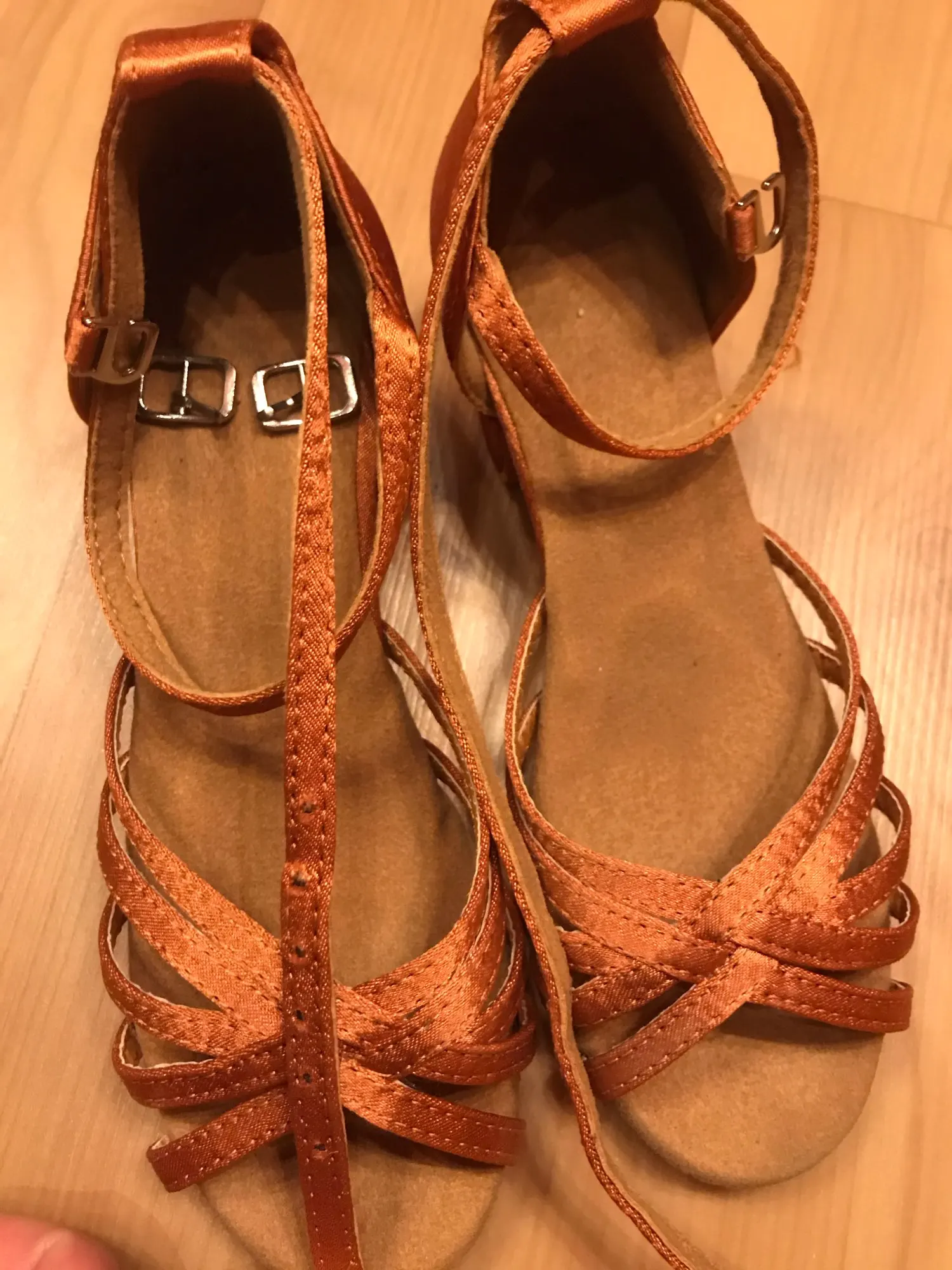 Нормальные туфельки. Маломерят. Заказала на размер больше. Впритык на стопу 18,3 см 19 размер. На узкую ногу. Ничем не отличаются от купленных в магазине для танцев, разве, что дырки на застежке пробиты не по центру, криво. За эту цену просто подарок.