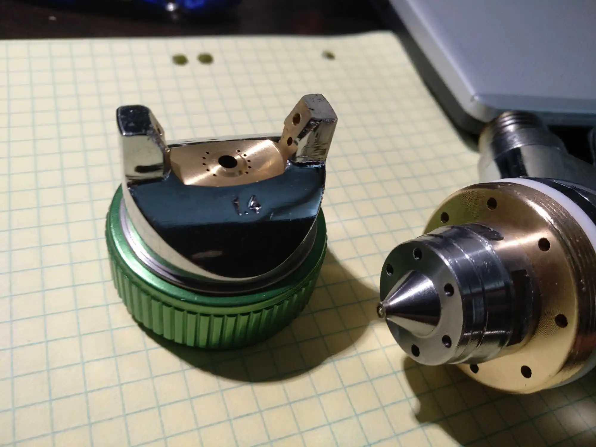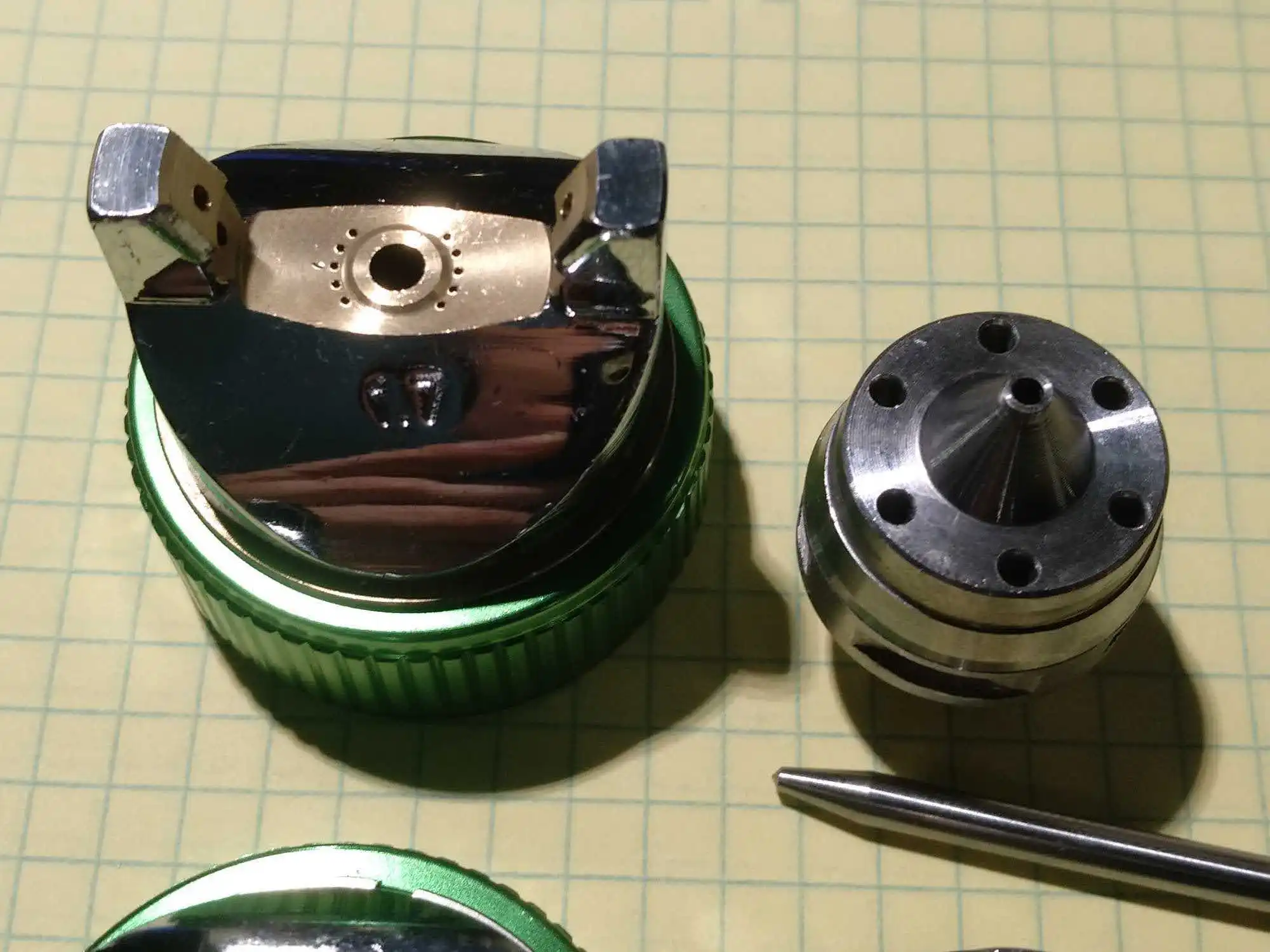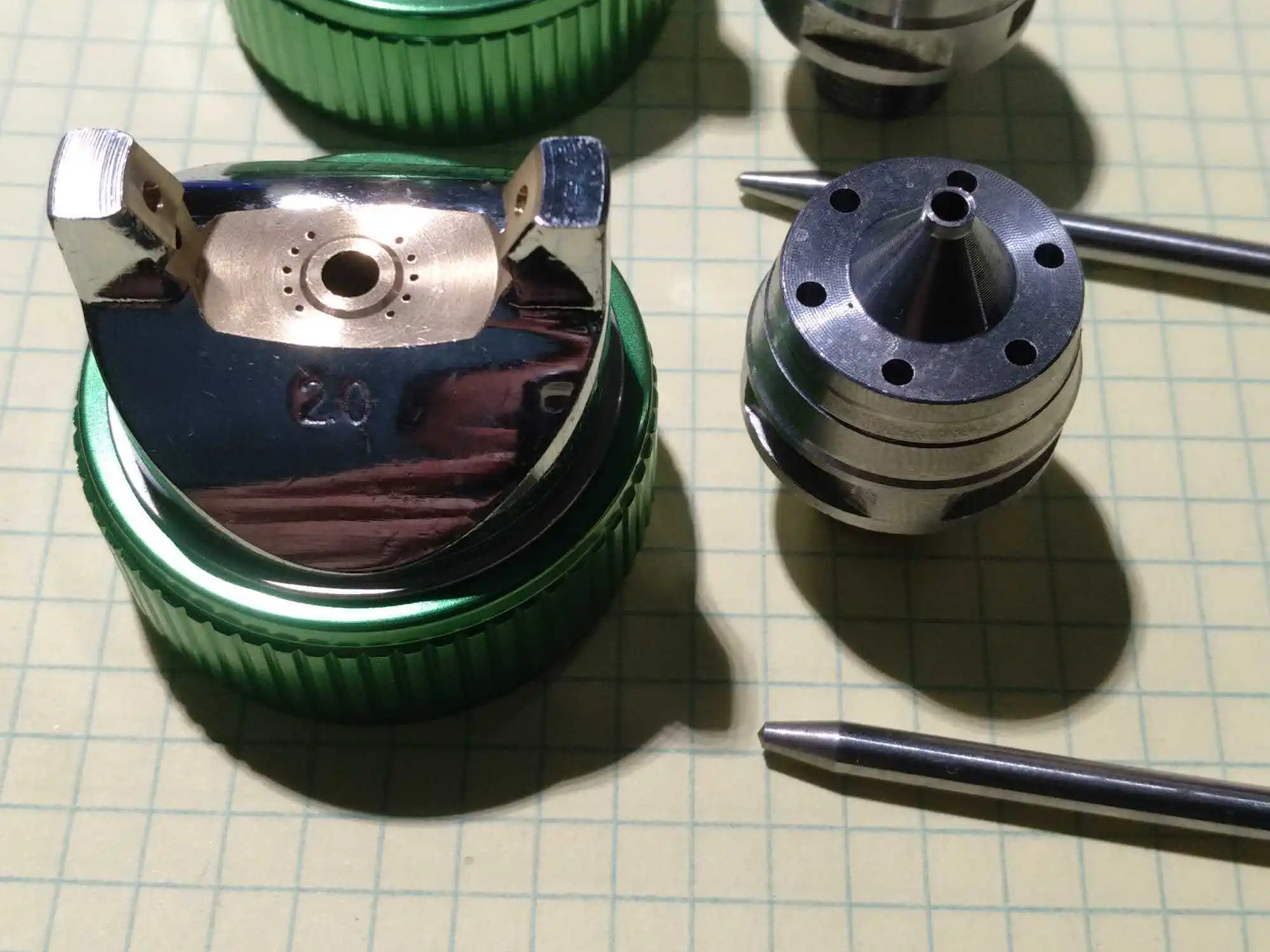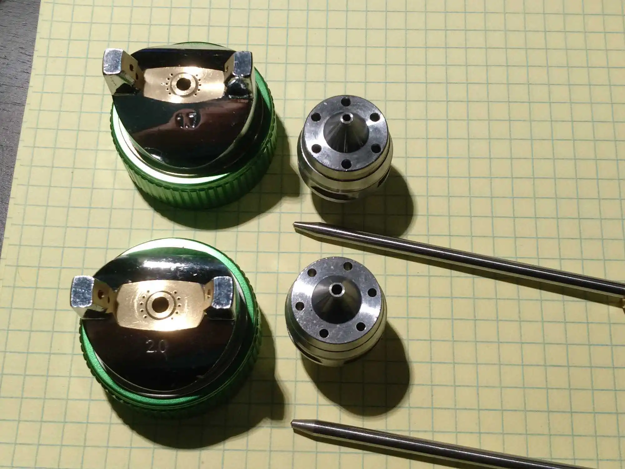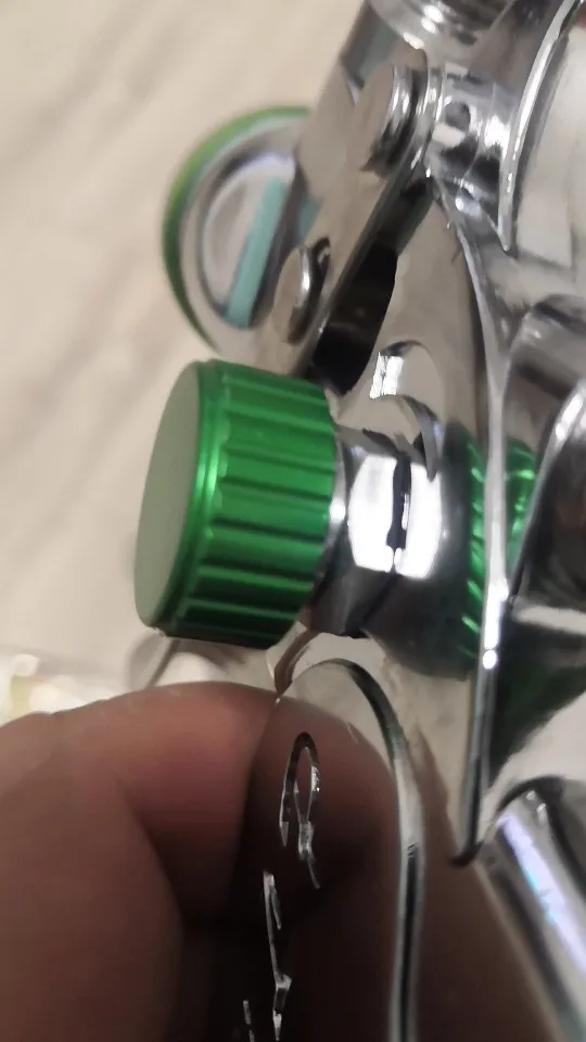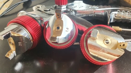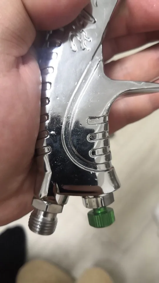 ручка литая - тяжеленькая, пистолет отцентрован, есть следы от отливки металла. С внутренних поверхностей также обработано неплохо. Сами дюзы не подписаны и иглы то же, можно спутать. После пробы в деле дополню отзыв.
