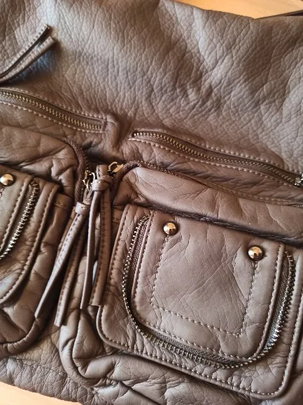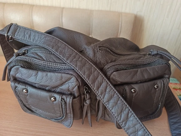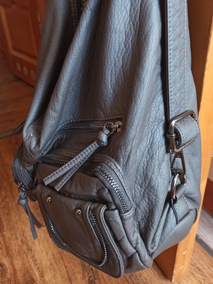 Моя первая сумка не из кожи за последние лет 8. Уж очень понравилась модель, поэтому купила. Она обалденная. Куча кармашков, стильно смотрится. Цвет в зависимости от освещения кажется то светлее, то темнее, то с ноткой коричневого. Носить буду через плечо, но возможно иногда и рюкзаком для разнообразия. Большая, но не безобразная. Надеюсь будет удобной. Доставка 2 недели. Большое спасибо.