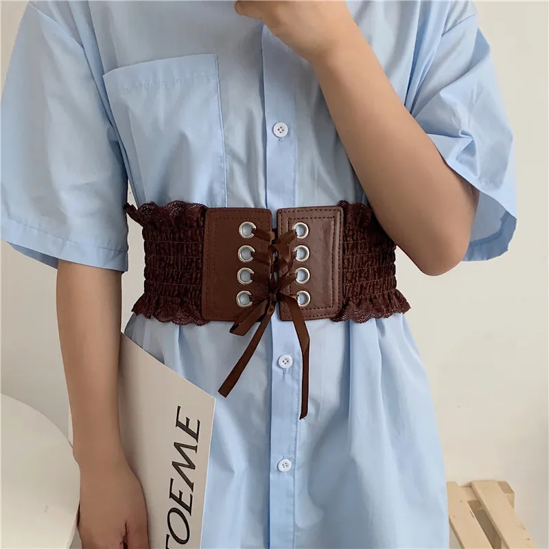 Модный широкий эластичный пояс с металлическим крючком для платьев, Свадебный популярный кружевной эластичный пояс с атласным бантом, коричневые ремни для женщин
