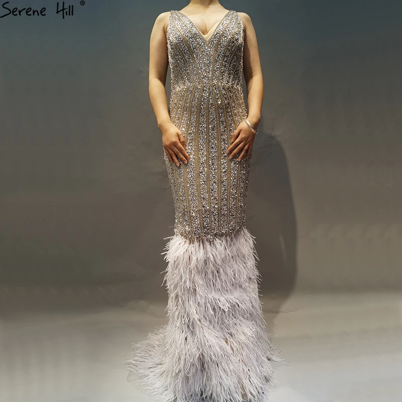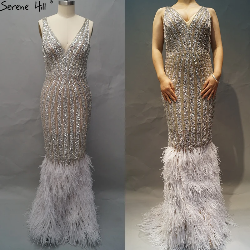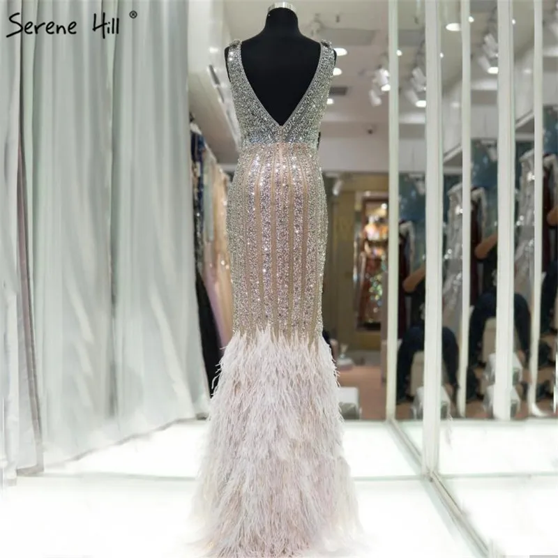 Дубай Роскошные перья Русалка сексуальные вечерние платья с v-образным вырезом без рукавов блестящие вечерние платья Serene Hill LA60749