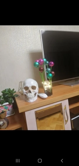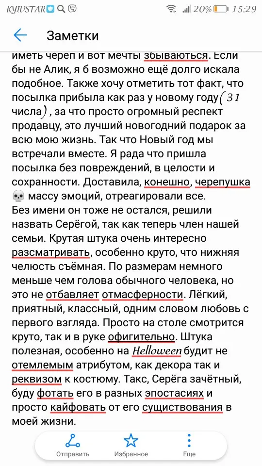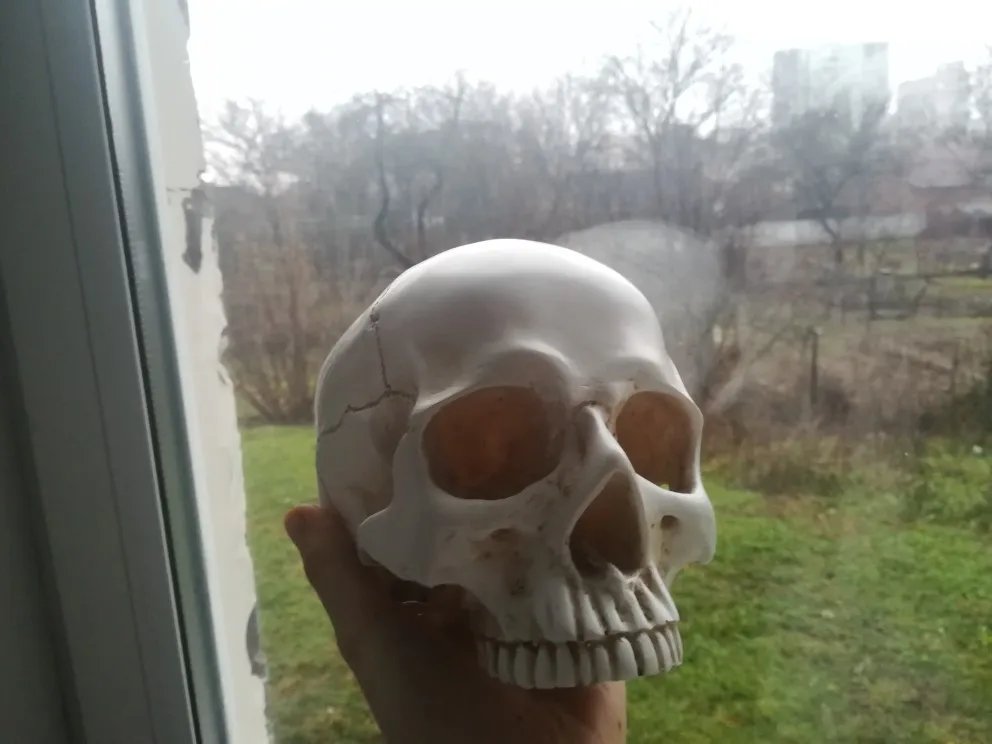 Это моя самая долгожданная посылка и самая крутетская покупка. С детства мечтала иметь череп и вот мечты збываються. Если бы не Алик, я б возможно ещё долго искала подобное. Также хочу отметить тот факт, что посылка прибыла как раз у новому году( 31 числа) , за что просто огромный респект продавцу, это лучший новогодний подарок за всю мою жизнь. Так что Новый год мы встречали вместе. Я рада что пришла посылка без повреждений, в целости и сохранности. Доставила, конешно, черепушка массу эмоций, отреагировали все. Без имени он тоже не остался, решили назвать Серёгой, так как теперь член нашей семьи. Крутая штука очень интересно разсматривать, особенно круто, что нижняя челюсть съёмная. По размерам немного меньше чем голова обычного человека, но это не отбавляет отмасферности. Лёгкий, приятный, классный, одним словом любовь с первого взгляда. Просто на столе смотрится круто, так и в руке офигительно. Штука полезная, особенно на Helloween будит не отемлемым атрибутом, как декора так и