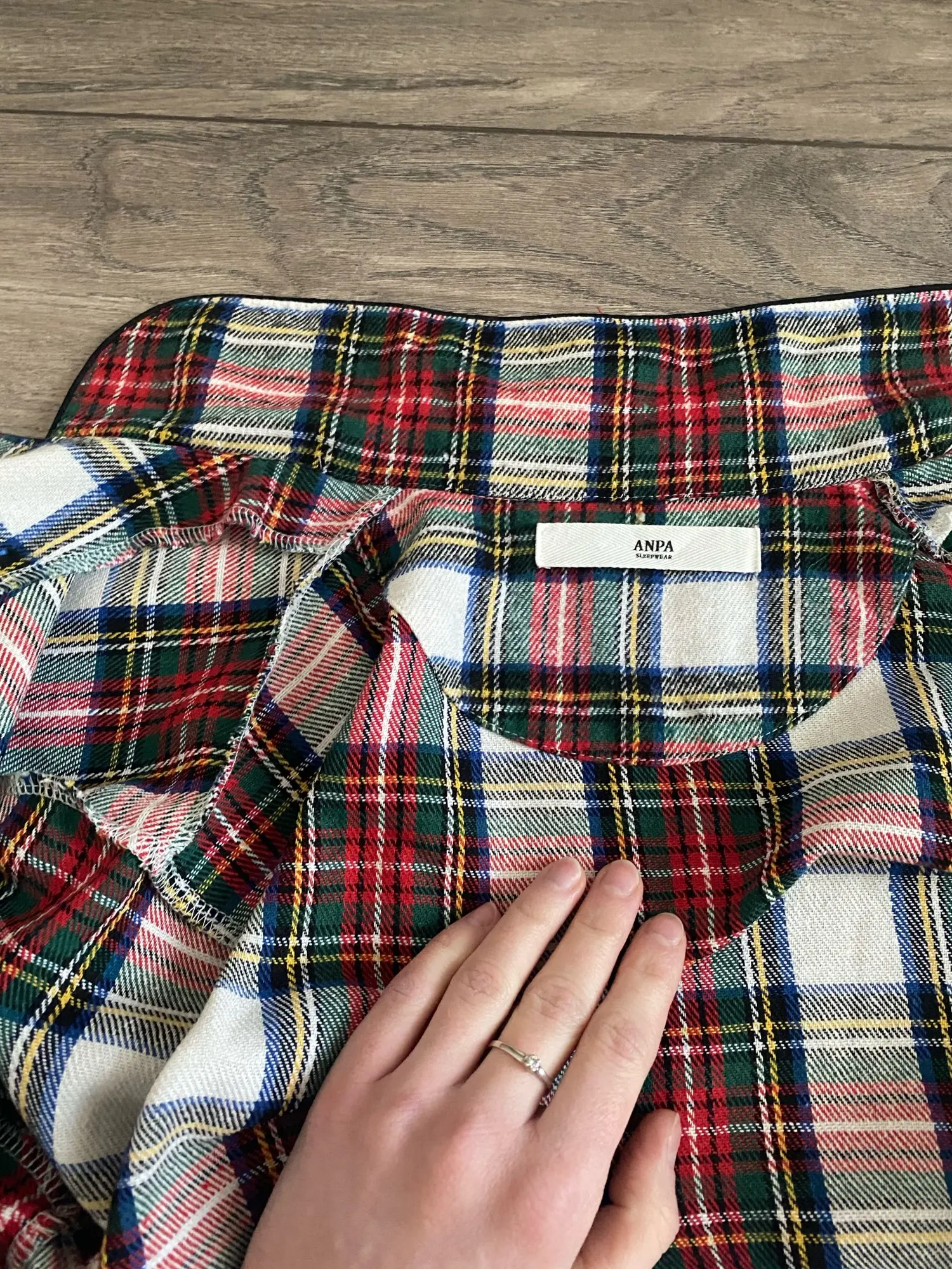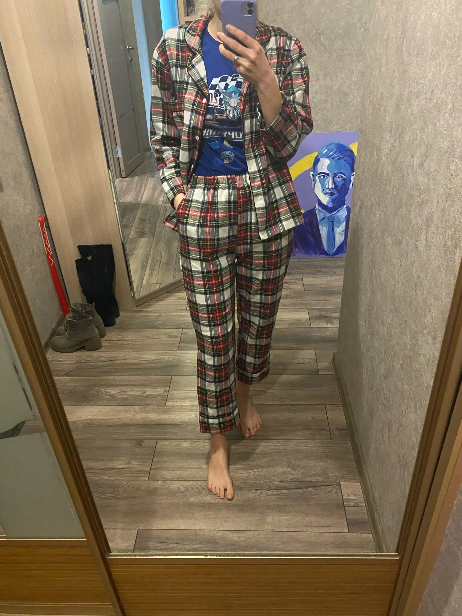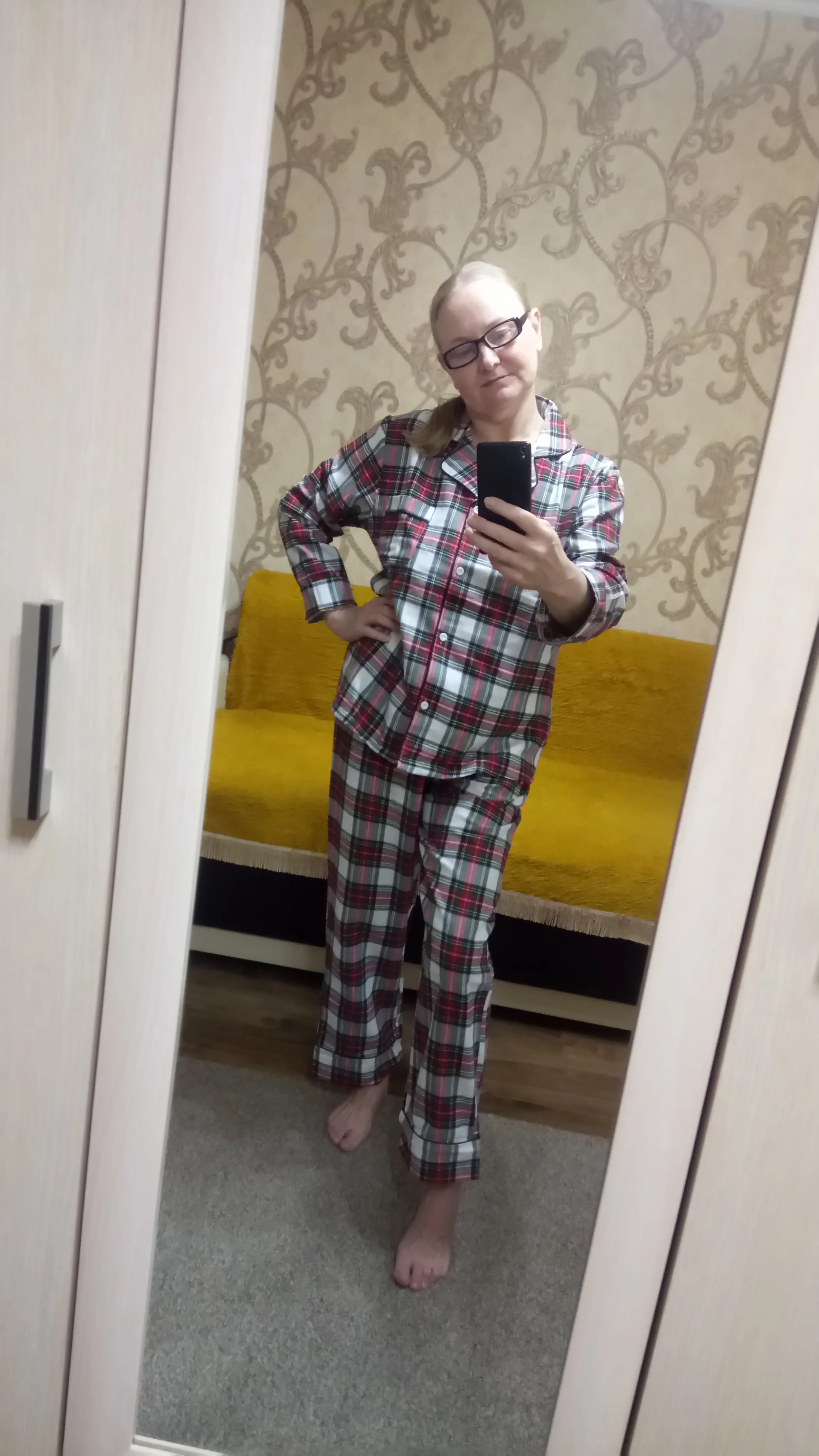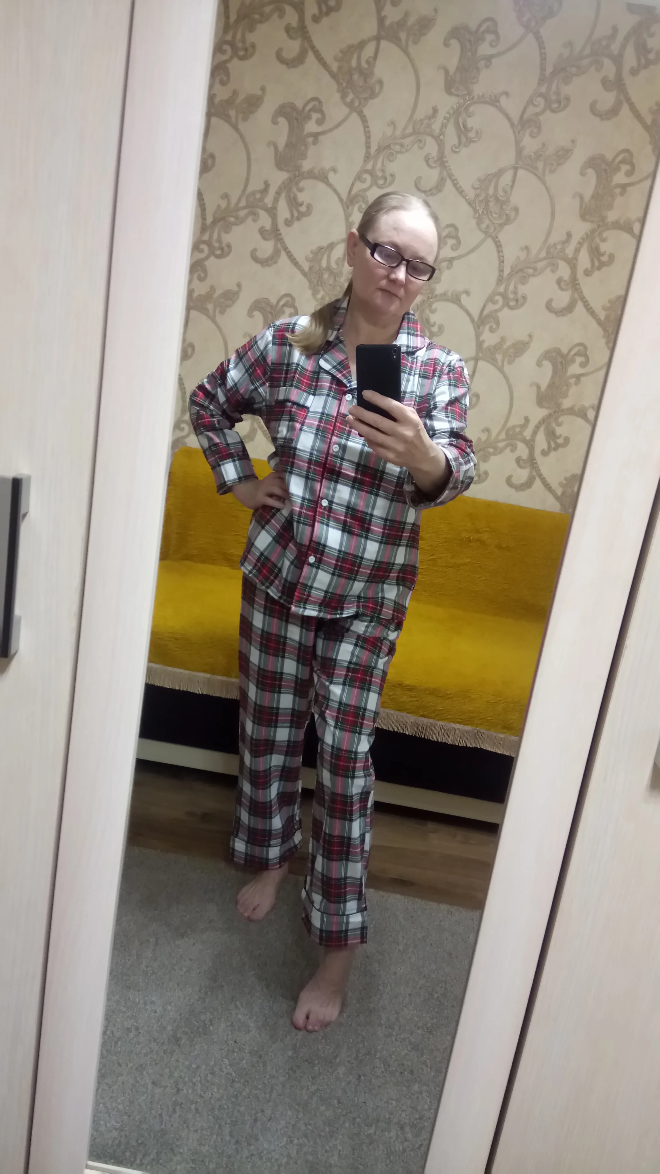 Вообще ношу одежду размера М. Почитав отзывы и измерив параметры, тоже решила взять М. В принципе подошло, но можно было и L брать, думаю. Было бы тогда оверсайз немного и подлиннее. На рост 165 брюки почти по щиколотку, рукава рубашки примерно 7/8. Надеюсь, после стирки не сядет. Ткань плотная, магкая, пижама очень теплая - для зимы будет идеально.