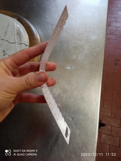 Тонкая картоночка, обклееная тонюсенькой пленочкой, которая уже при пересылке отвалилась. Это не может быть инструментом для шитья. И когда продавец пишет, что ультратонкая мягкая линейка - надо понимать, что "линейка, вырезанная из тонкого листа бумаги".