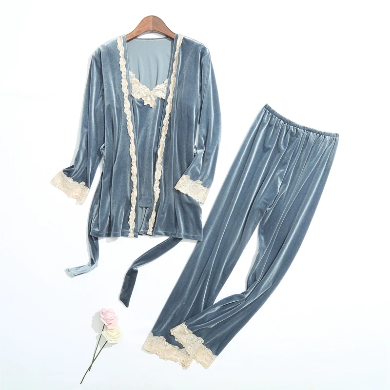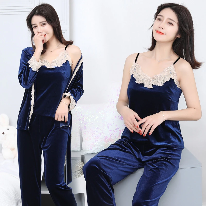 Новинка, осенне-зимняя Пижама для женщин, комплект из 3 предметов с длинным рукавом, золотистая бархатная Пижама, женская одежда для сна, пижамные комплекты