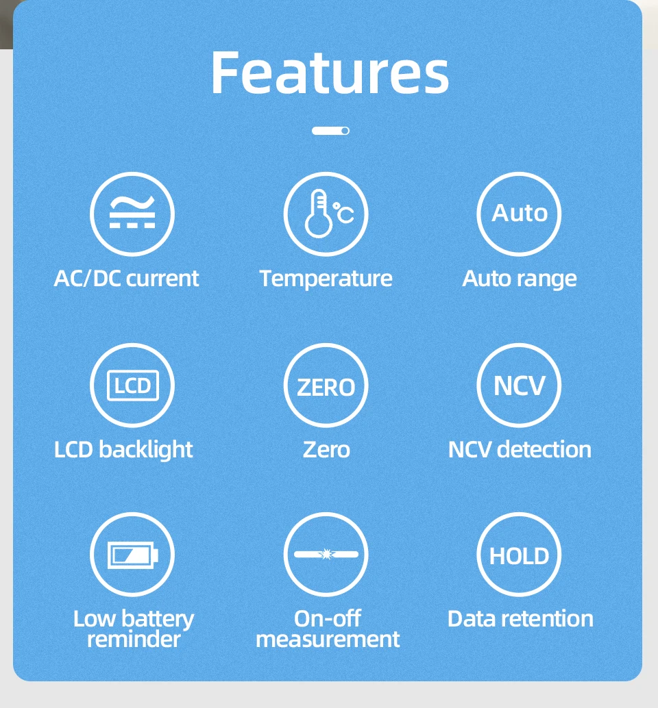 Автоматический диапазон, 2000 отсчетов, AC/DC ток, AC/DC напряжение, сопротивление, емкость, измерение температуры, частота, нулевое измерение (модель тока постоянного тока)