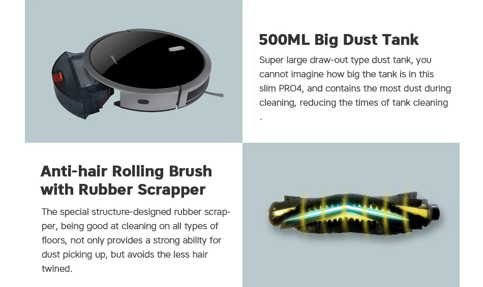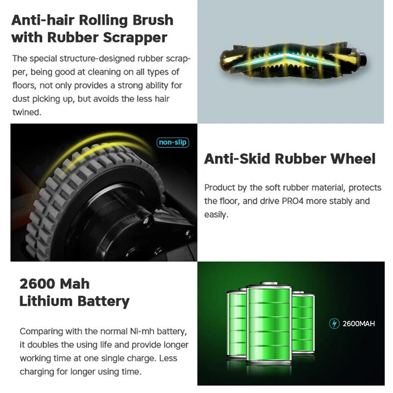 1. До 1400 ПА всасывания powerwith Max.mo de может вакуумной пыли в бак пыли легко2. Прочные боковые щетки для сбора пыли рядом3. Центральная щетка с резиновым скраппером увеличивает способность уборки и сбора пыли, специальная конструкция сделана для меньшего объема волос