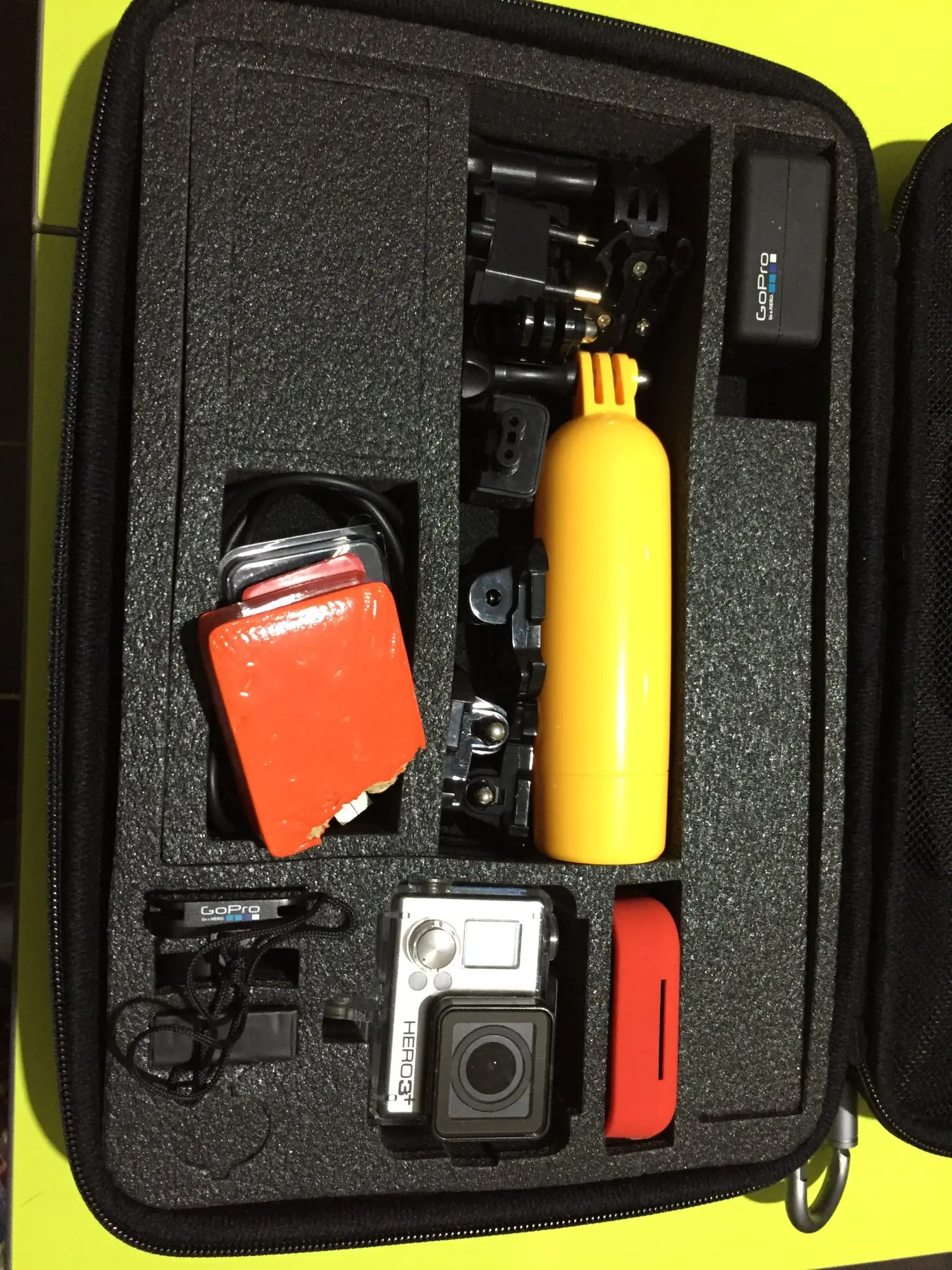 под гоупро 8 не подходит. просто камера без аквабокса в посадочном месте болтается как говно в проруби весной. в аквабоксе просто не помещается в это место. пришлось колхозить и вырезать. поролон жетский только когда он один большой кусок, если вытащить из него ячейки то перемычки между отсеками становятся жидкими и сильно гнутся. в кейс засунул: трипод, камера+аквабокс, крепления на грудь, голову и руку, несколько креплений под камеру с двойным скотчем, несколько переходников и крепление на трубу или руль велосипеда. скоро жду дополнительную зарядку с двумя батарейками и поплавок для воды... и я честно хз куда все это пихать в кейс, брал максимальный размер, оказалось нужен еще больше.