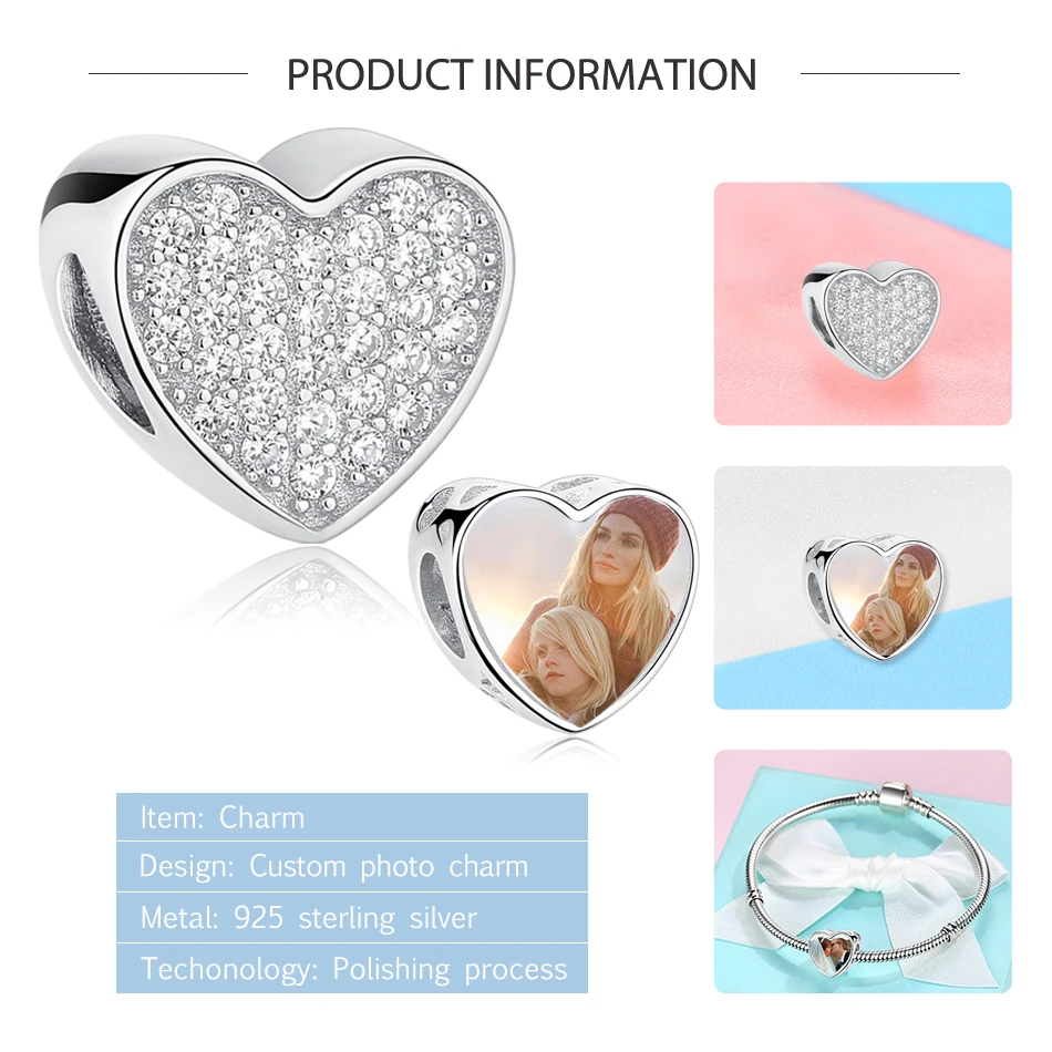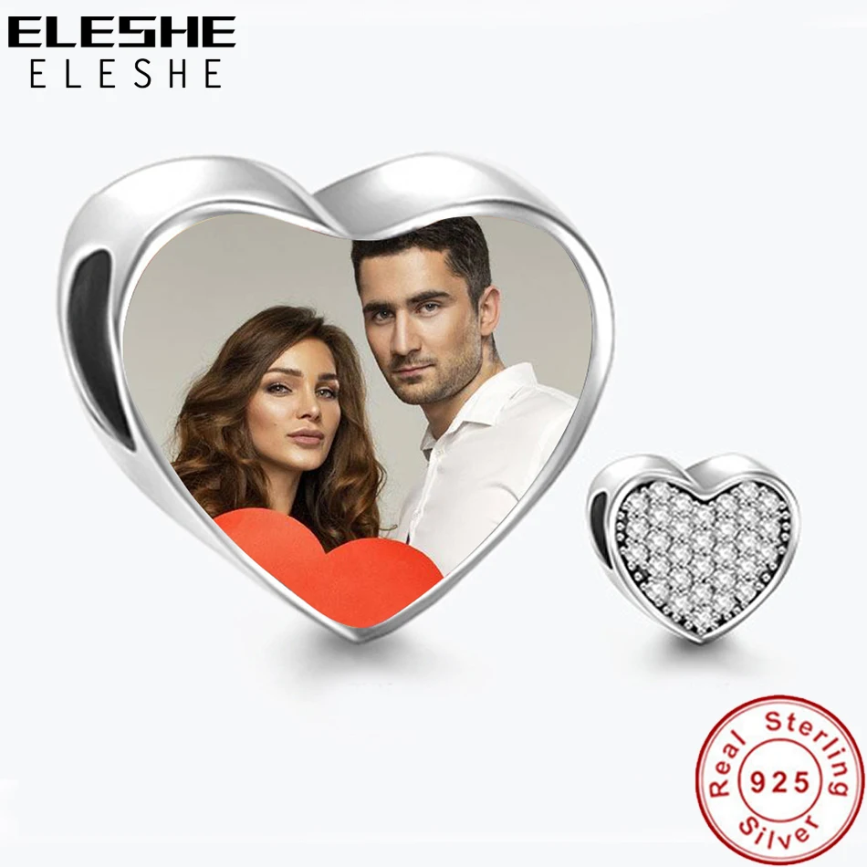 ELESHE, персонализированные пользовательские фото 925 шарма стерлингового серебра с украшением в виде кристаллов в форме сердца бусы, подходят к оригинальному браслету, сделай сам, настоящее ювелирное изделие в подарок