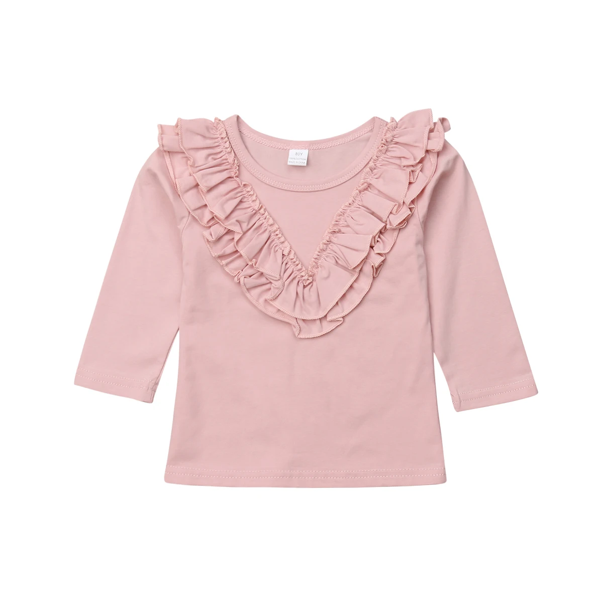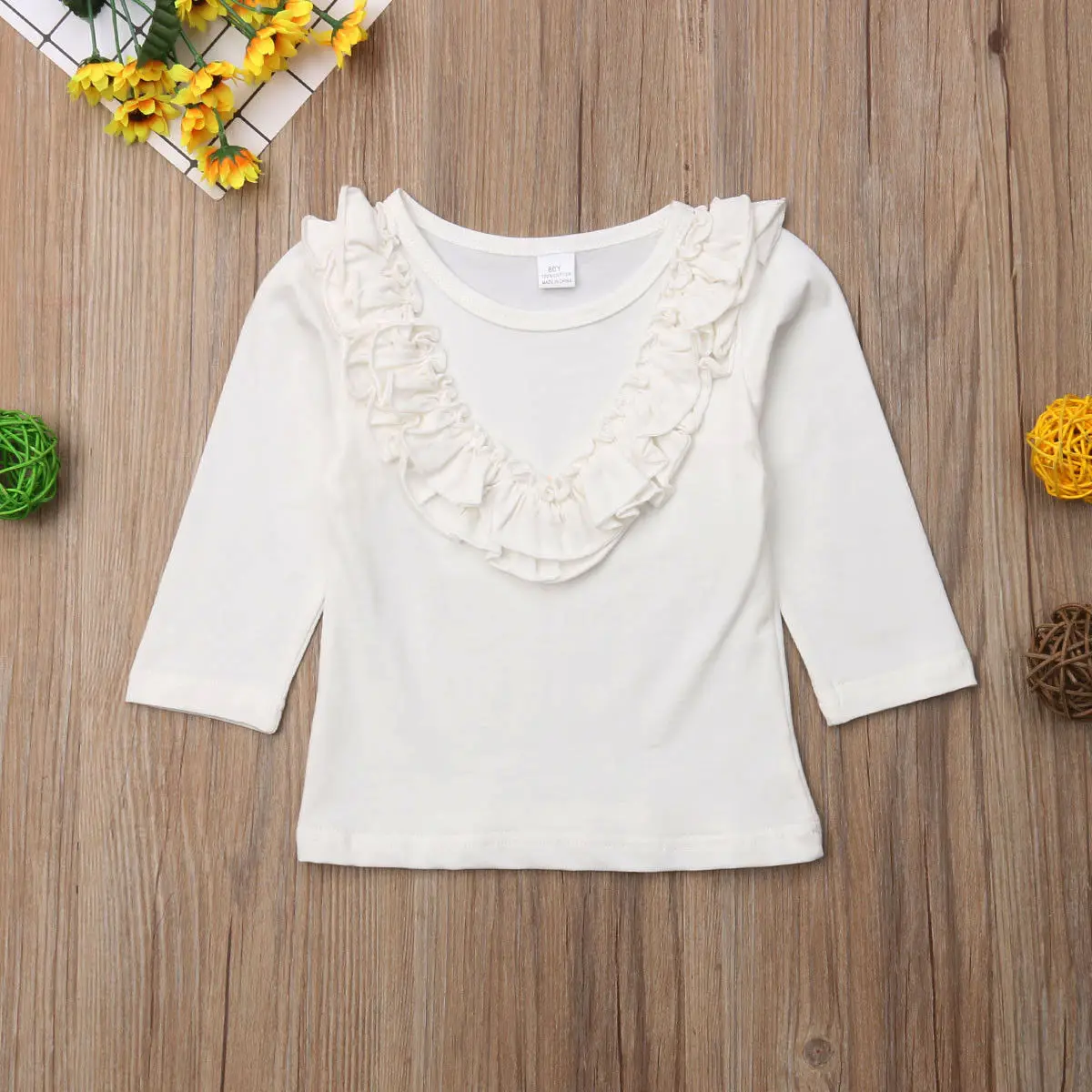 Повседневные хлопковые футболки для маленьких девочек, однотонные топы с оборками и длинными рукавами, детский пуловер для девочек, топы, осенняя одежда, одежда для детей 2-6 лет