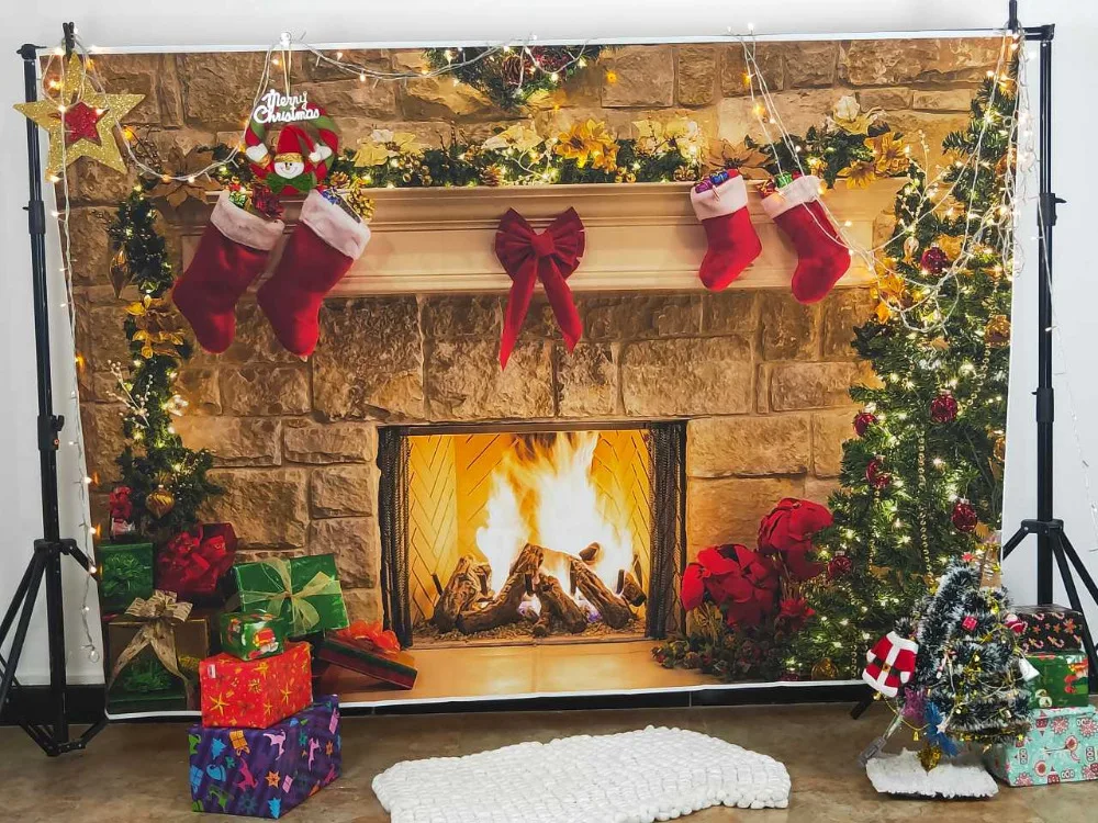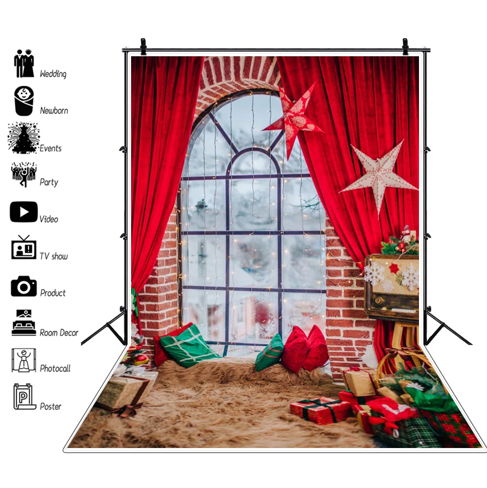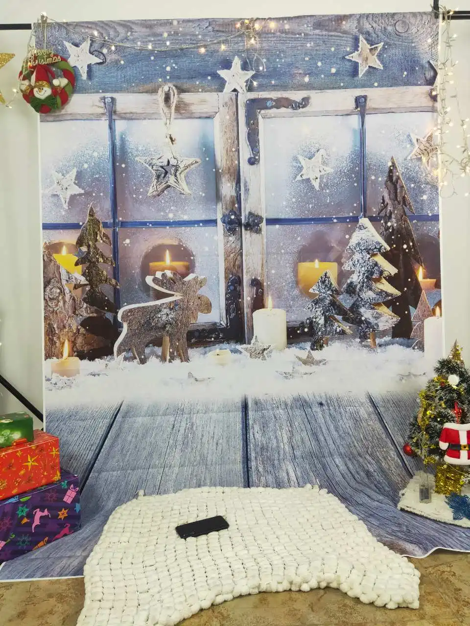 Фон для фотографий с изображением рождественской сосны, снега, детских игрушек, подоконника, деревянной доски, детских кукол, фотосессия Фотостудия