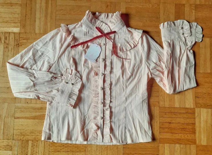 Блузка пришла с химическим запахом, но это единственный негативный момент, который я могу сказать. Цвет персиково-розовый, ткань легкая и имеет тканый узор, который был основной причиной, по которой я его купил. Размер точный, красная лента-бархат винного цвета и булавка. Бонусные баллы за то, что бирка не находится в области шеи, а сбоку! Эта блузка милая и отличная покупка, я предпочитаю ее носить поверх шифона. Этот продавец всегда рад иметь дело, доставка была очень быстрой, несмотря на текущее положение (отправлено в 19th февраля, прибыло 25 марта).