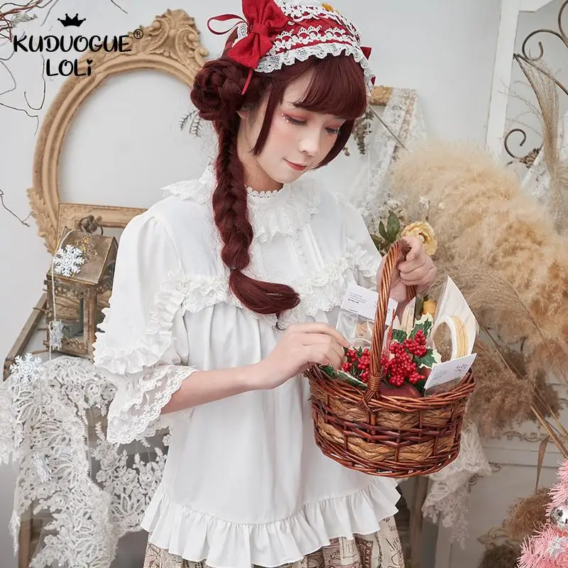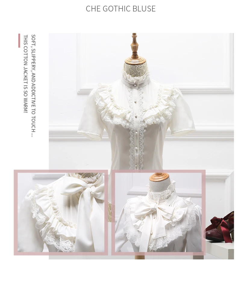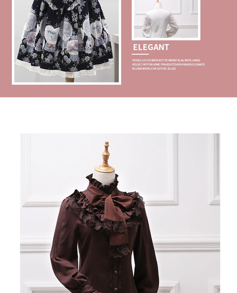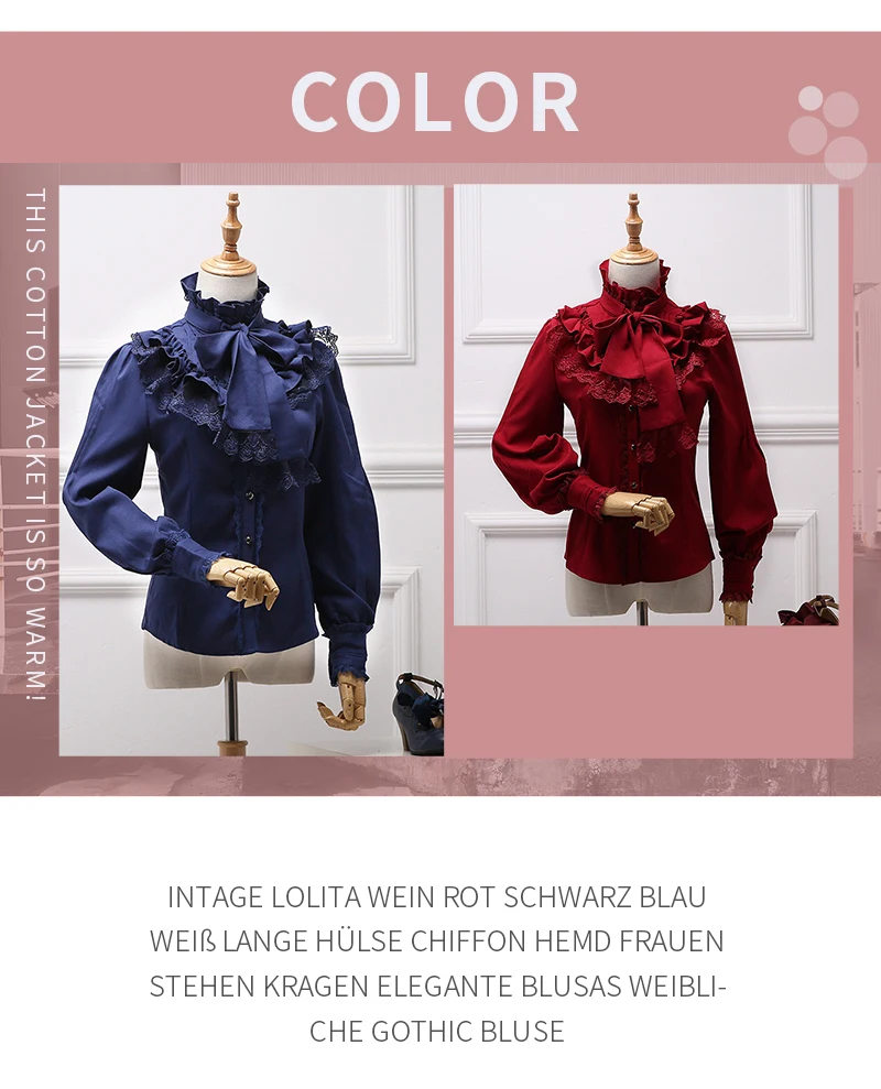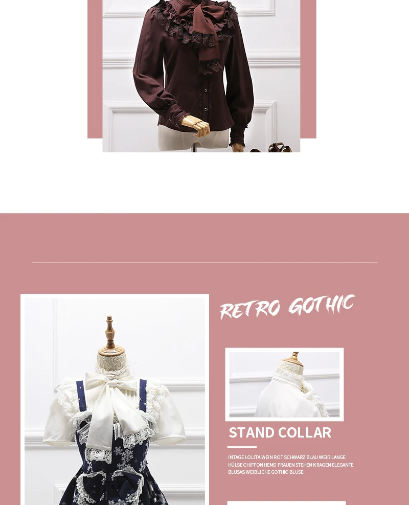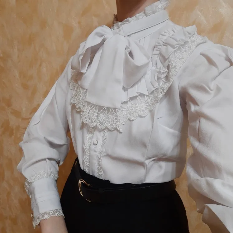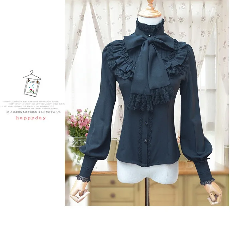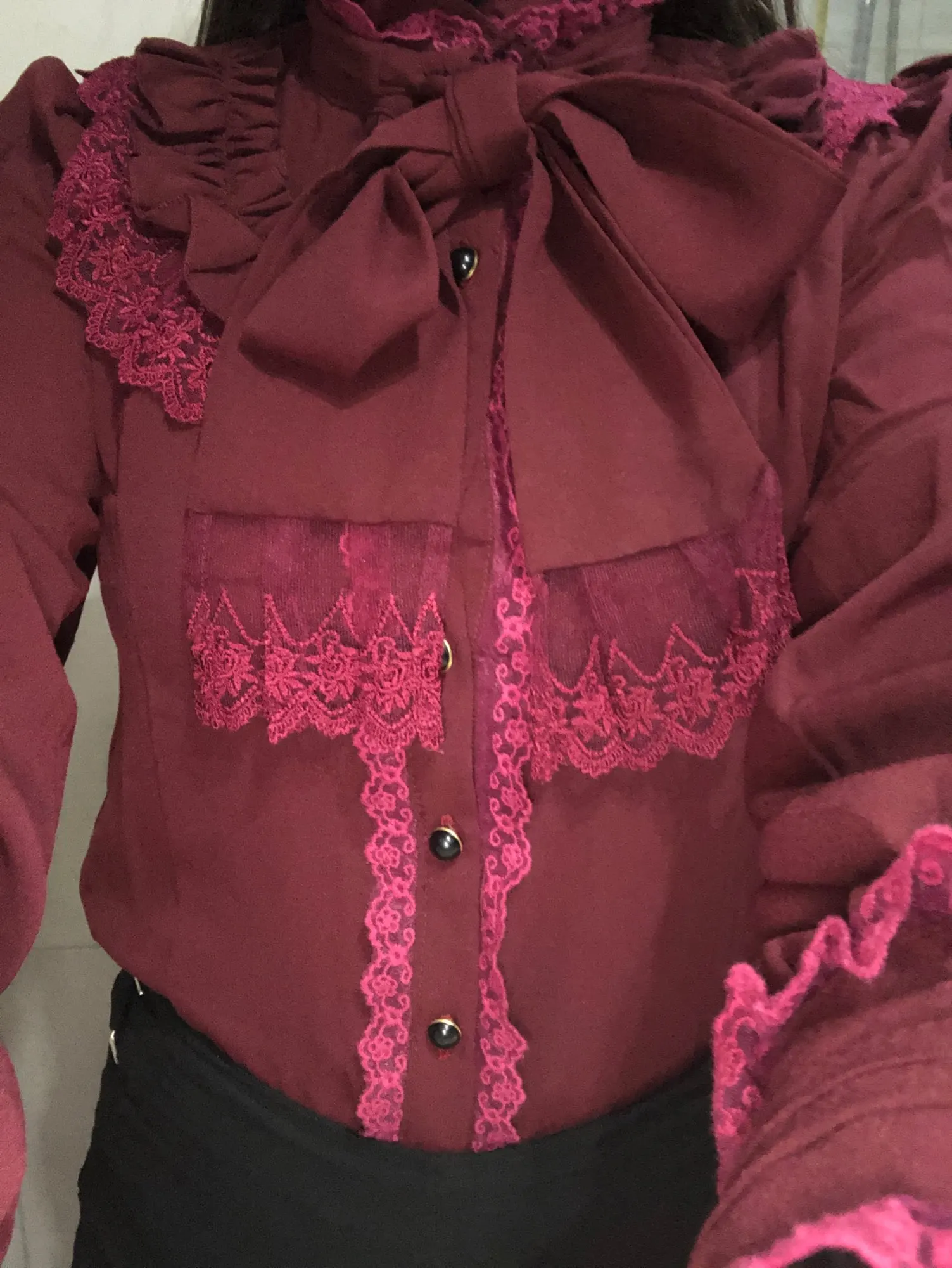 Блузка женская шифоновая с длинным рукавом, винтажная элегантная Готическая кружевная рубашка в Стиле Лолита, с воротником-стойкой, красная, черная, синяя, белая