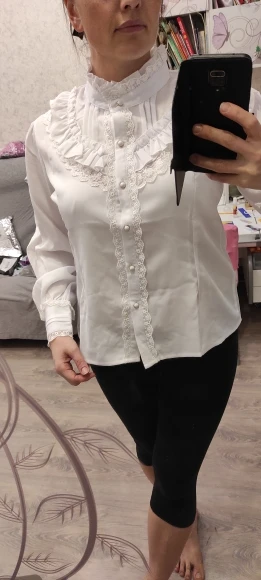 Своих денег не стоит. Оборки на груди пришиты ассиметрично, что бросается в глаза. Манжеты еле застегиваются, несмотря на то, что в целом размер мне подошел. Воротник не такой, как на фото, он не стойкой, из-за чего сложно завязать бант. Словом, за такие деньги можно было ХОТЯ БЫ сшить аккуратную вещь и адекватно произвести замеры на манжетах (левая застегнулась с горем пополам на одну пуговицу из двух, правая же вообще не застегнулась, что говорит о наплевательском отношении производителя к замерам, а продавца - к покупателям). Верните деньги или, с какой стати, вы меня извините, Я СКАНДАЛ ТАКОЙ УЧИНЮ!!! P.S. Материал жаркий, но на это уж глаза закрою. Отправляли долго. Сколько точно дней не помню.