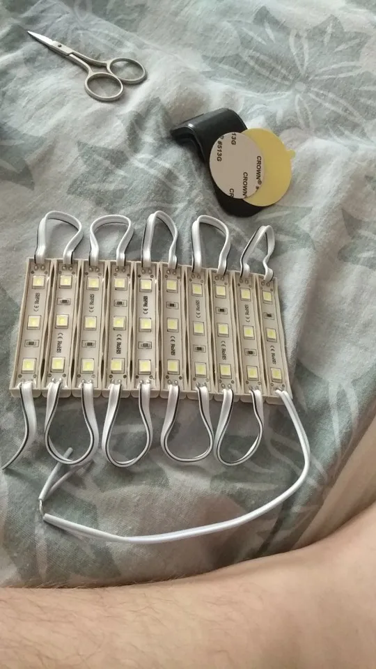 Качество очень низкое, но это еще не слишком долго, чтобы подтвердить его. Я надеюсь, что свет будет интенсивным. Три светодиода за штуку. Кабель можно отрезать и использовать отдельно. Я буду использовать его для подсветки внутри микроавтобуса.