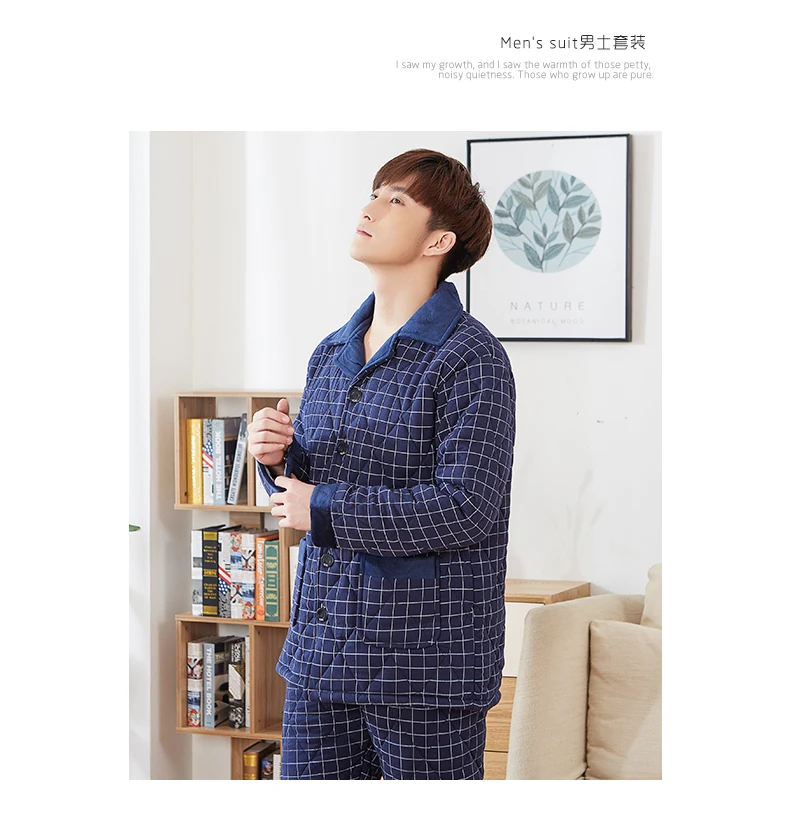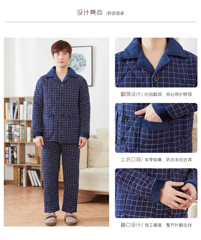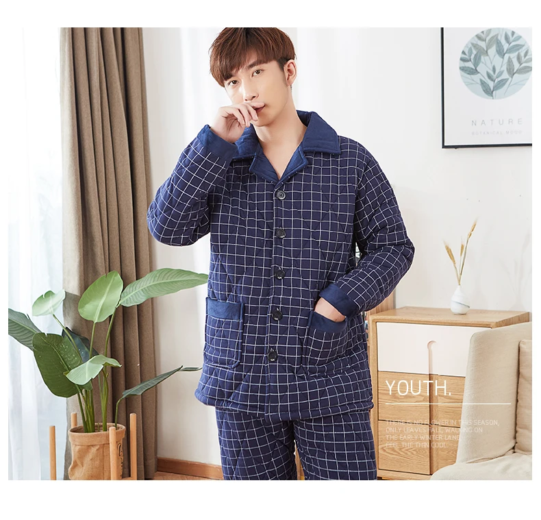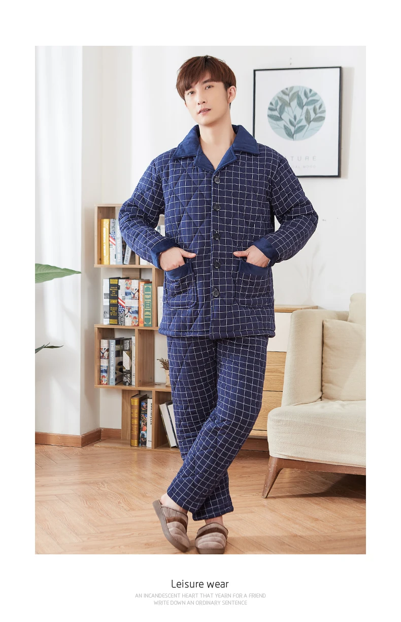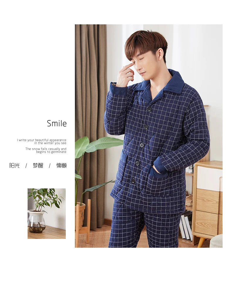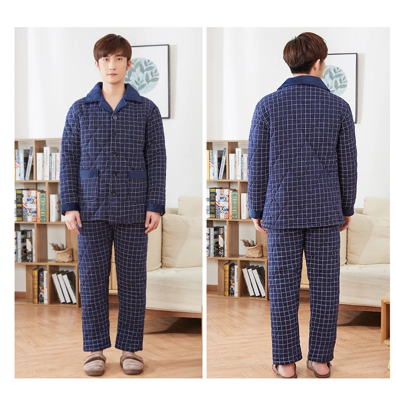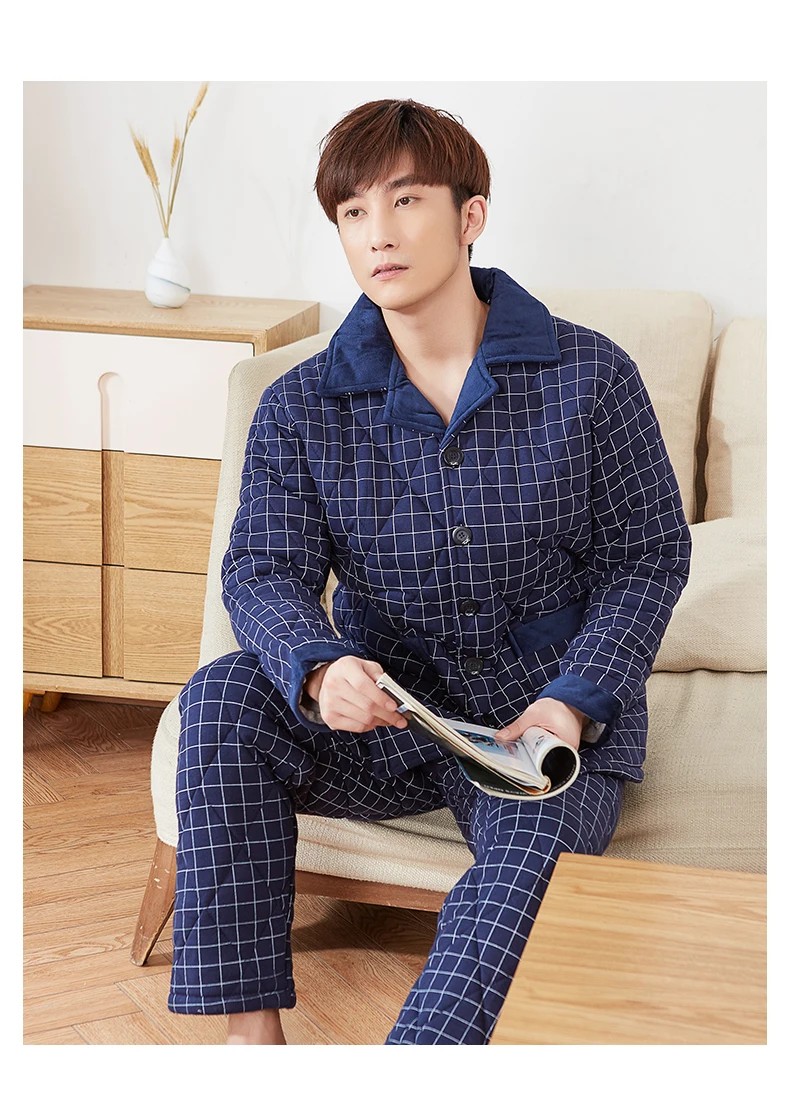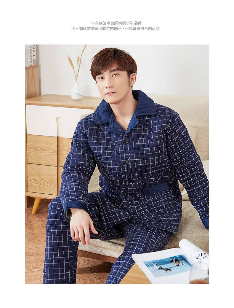 Мужские клетчатые узоры пижамные комплекты из трех предметов толстой подкладкой зимняя Пижама Мужская стеганая куртка хлопковая стеганая пижамы размера плюс L-3XL