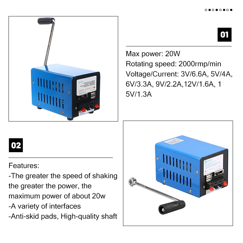 -Генератор Динамо, чем больше скорость тряски, тем больше мощность, максимальная мощность около 20 Вт
