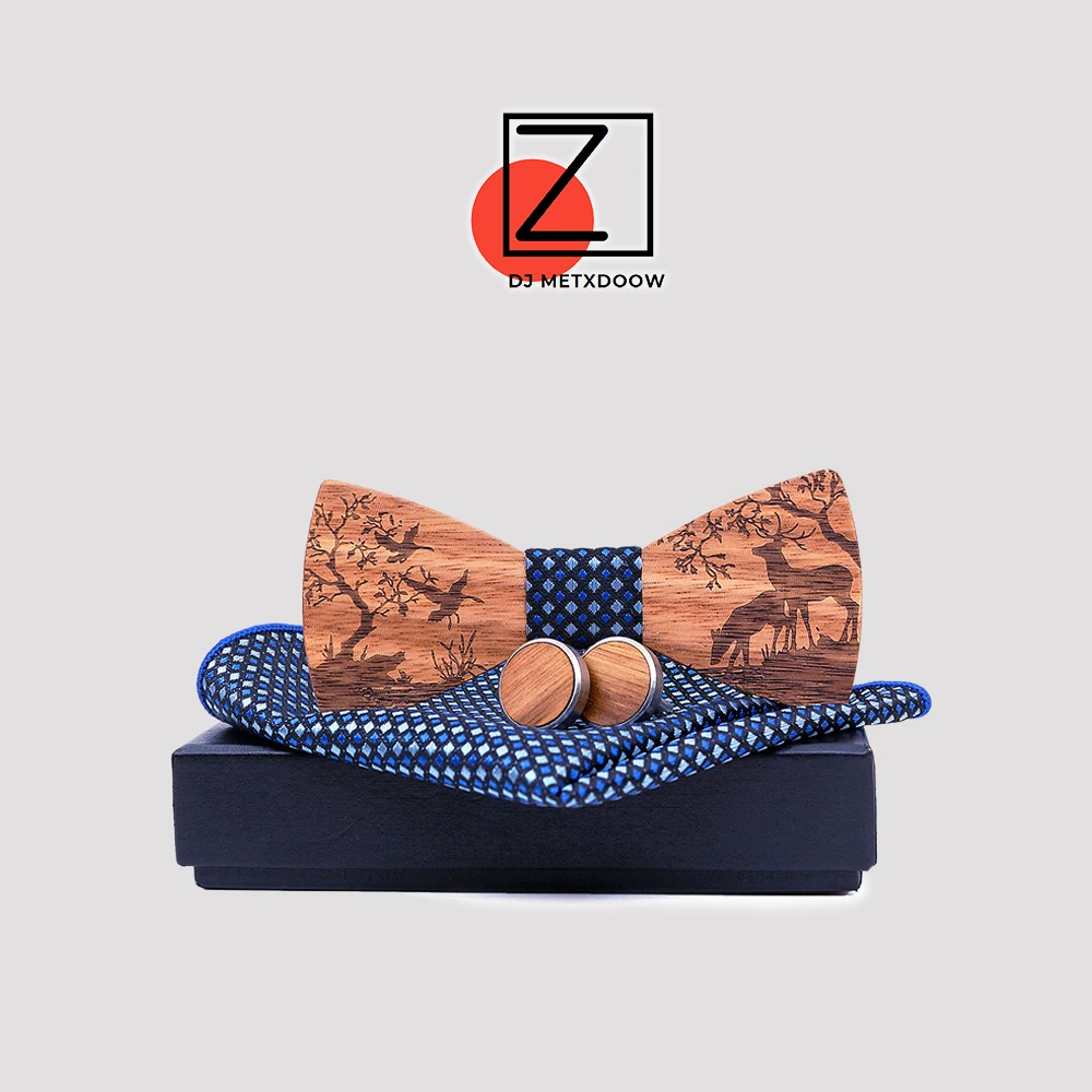 Деревянный галстук-бабочка + носовой платок + запонки, набор для свадьбы, жениха, деревянные галстуки-бабочки