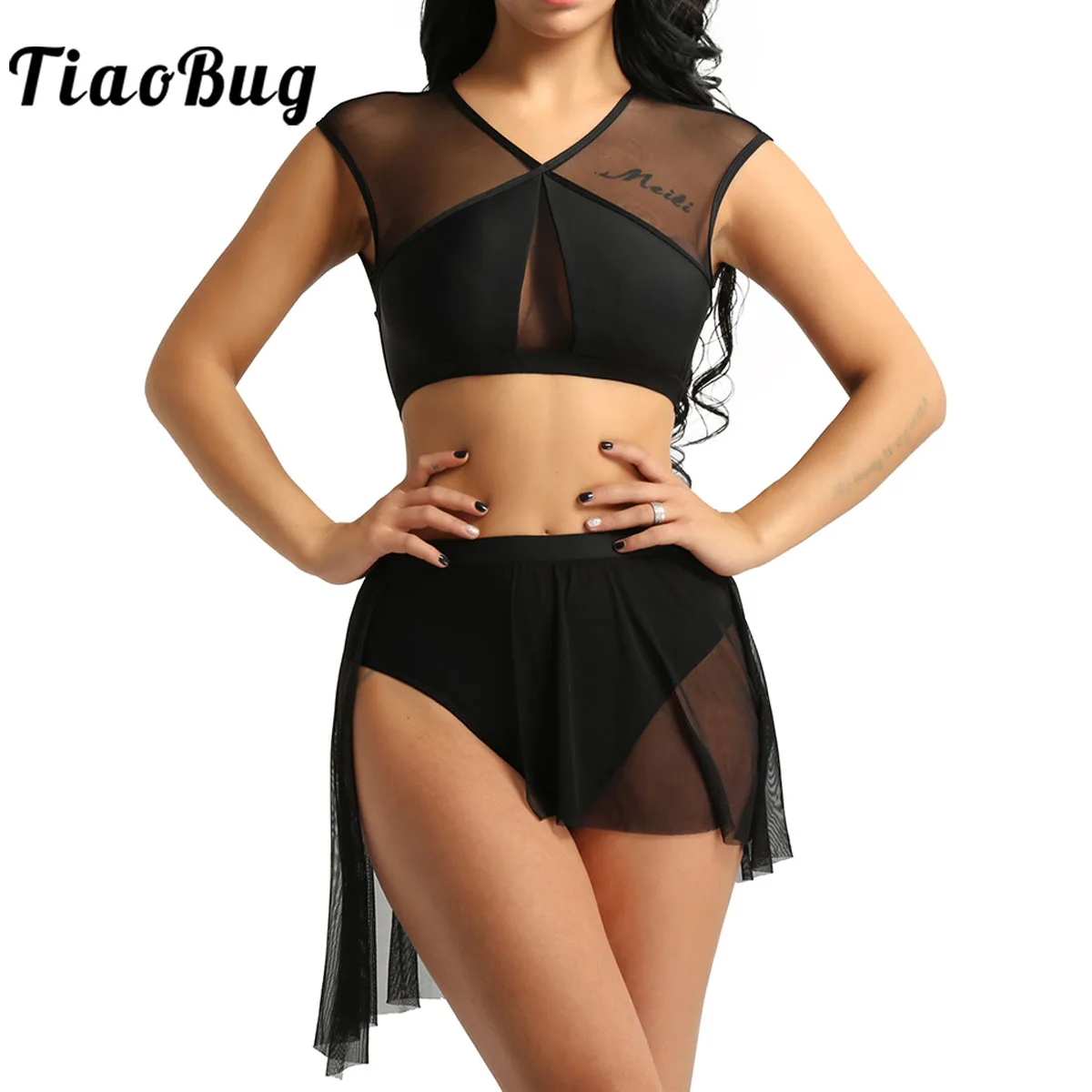 Женский ассиметричный танцевальный костюм, сетчатый укороченный топ с Одежда для танцев, пачка балериной, трико с юбкой