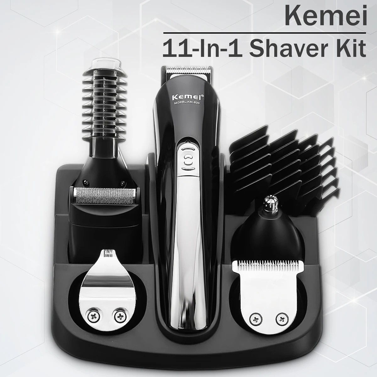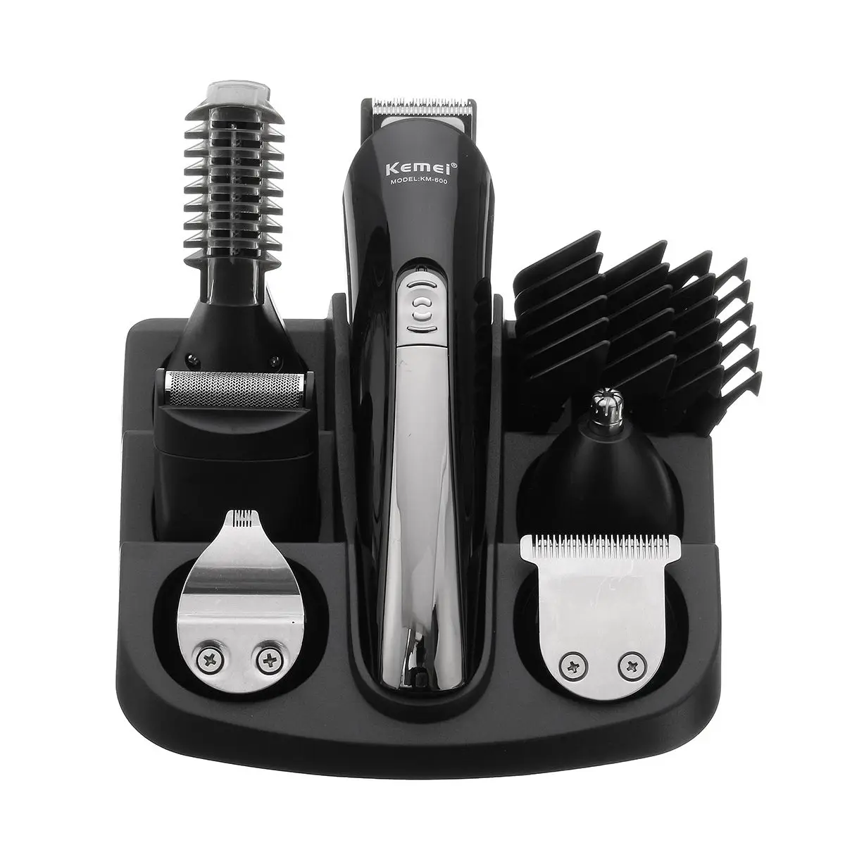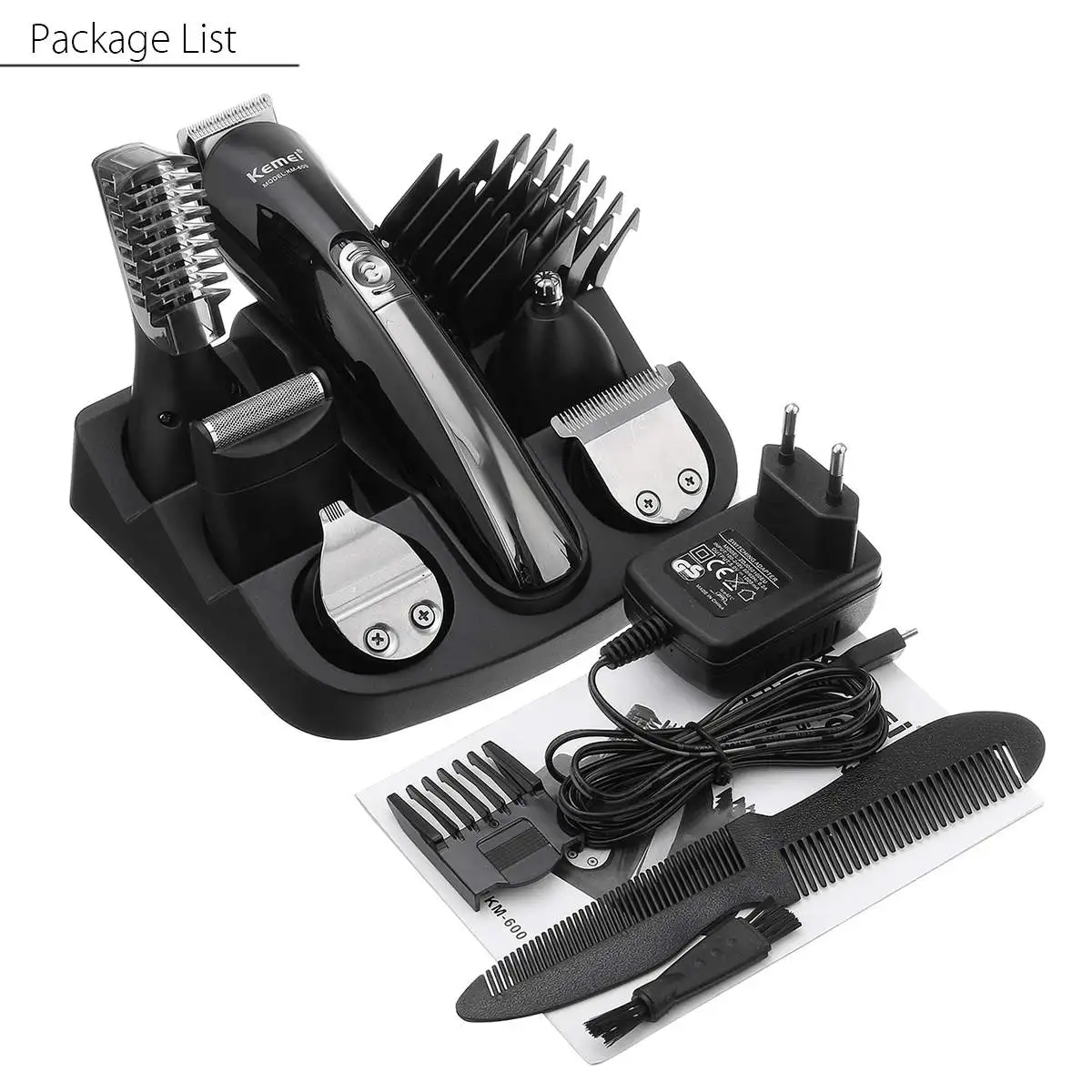 Особенности:1. Это Набор для стрижки волос 11 в 1. Вы можете использовать различные аксессуары для бритья участков волос и удаления раздражающих ушных волос, бровей и волос на лице.2. Различные точные концевые расчески: 3 мм, 6 мм, 9 мм, 12 мм, свободно и легко контролировать длину волос, удобно делать различные стили волос, подходит для любого возраста.3. Оснащен базой, которая позволяет положить все виды аксессуаров аккуратно и упорядоченно собрать для удобного хранения и переноски.4. Встроенная перезаряжаемая батарея, 8 часов зарядки, может использоваться до 20 дней. Характеристики:Название: машинка для стрижки волосМодель: KM-600Бренд: KEMEIЦвет: черныйМатериал: АБС (акрилонитрил бутадиен-стирол)Напряжение: AC100-240V/50-60 ГцМощность: 5 ВтВремя зарядки: 8 чВремя работы: 2 ч (полная зарядка может бриться около 20 раз)Выход: DC5V/1AВвод клипера: DC3.6VТип вилки: штепсельная вилка европейского стандартаЕмкость аккумулятора: 600 мАч Посылка включает в себя:1x машинка для стрижки1x Шнур Питания1x Руководство пользователя1 основание1x щетка1x Desugn триммер1x точный триммер1x триммер для носа1x микро-бритва1x триммер для тела4x направляющие расчески для полноразмерного триммера и точного триммера (3 мм/6 мм/9 мм/12 мм)1x направляющая расческа для триммера тела1x направляющая Расческа для точного триммера1x гребень Примечание:1. Не помещайте машинку для стрижки под прямыми солнечными лучами, рядом с жаром или огнем.2. Не допускайте контакта сетчатого лезвия с острыми или твердыми предметами, включая ногти. Он чрезвычайно тонкий и может повредиться и повредить вашу кожу.3. Если клипер или шнур повреждены каким-либо образом, обратитесь в центр обслуживания. Не пытайтесь самостоятельно отремонтировать бритву.
