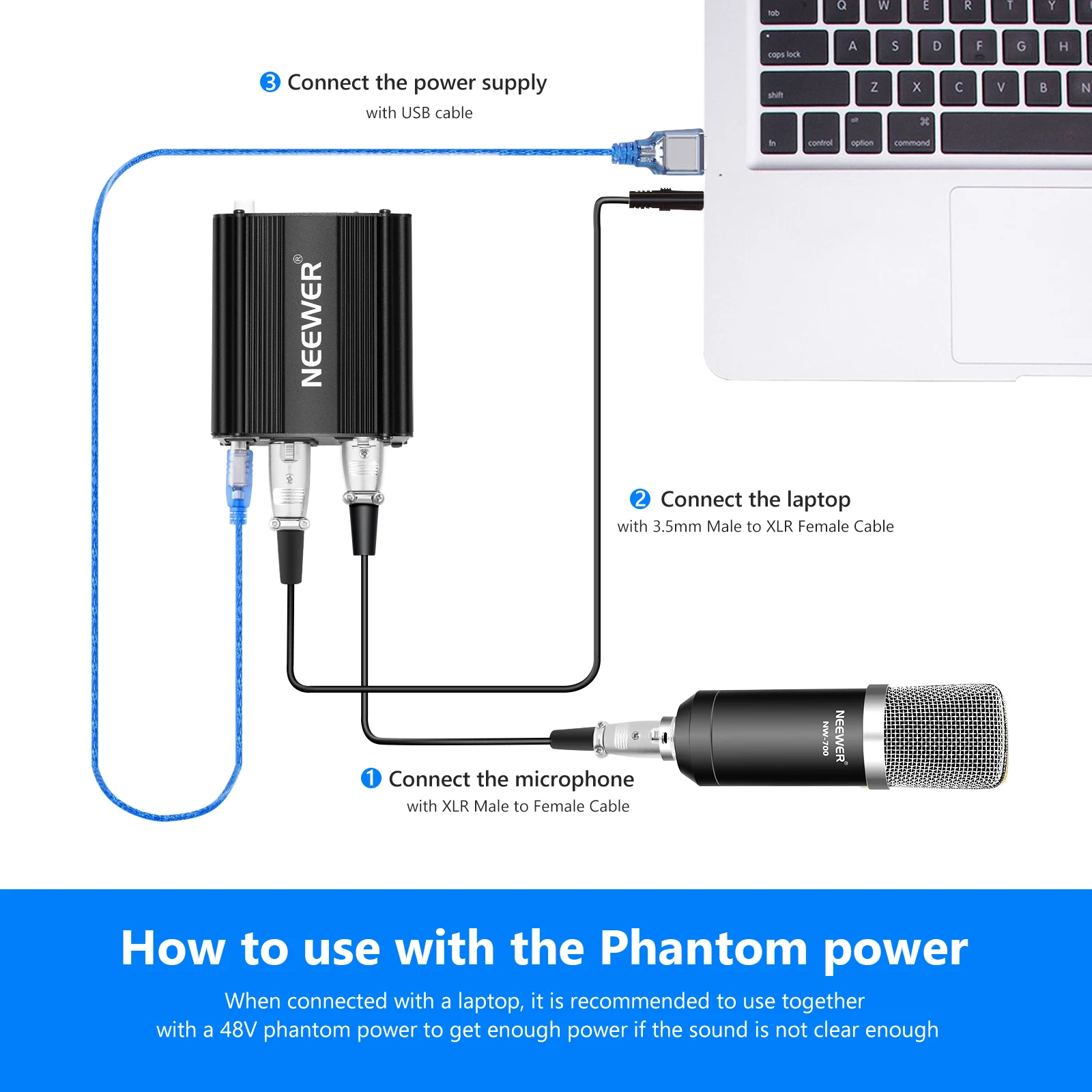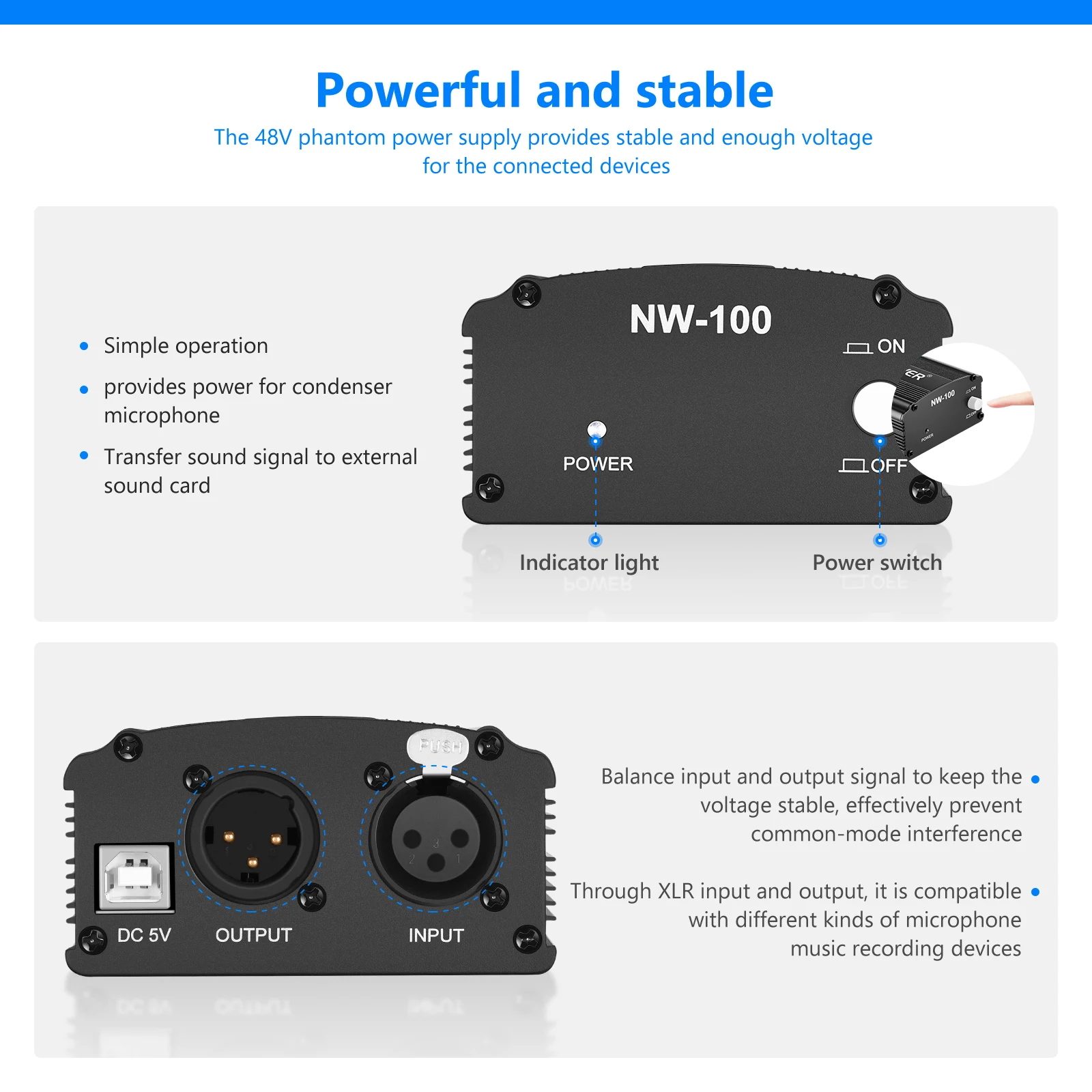 48 в USB фантомный источник питания: он обеспечивает надежное 48 В фантомное питание непосредственно от usb-кабеля для конденсаторных микрофонов и передачи звукового сигнала на звуковую карту точно и полностью; имеет одноканальный блок с сбалансированными микрофонными входами и выходами для подключения в линии с вашим микрофоном и микшером; Совместим со всеми видами микрофона и оборудования для записи музыки