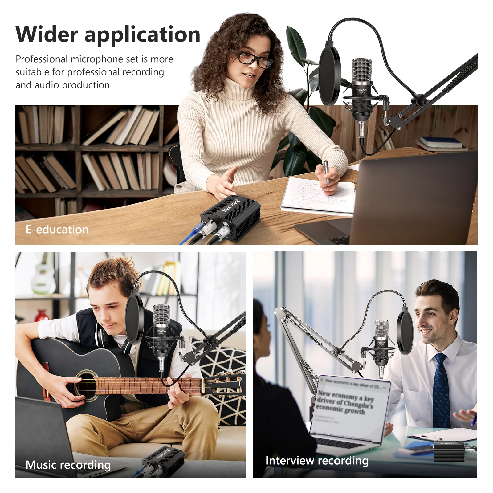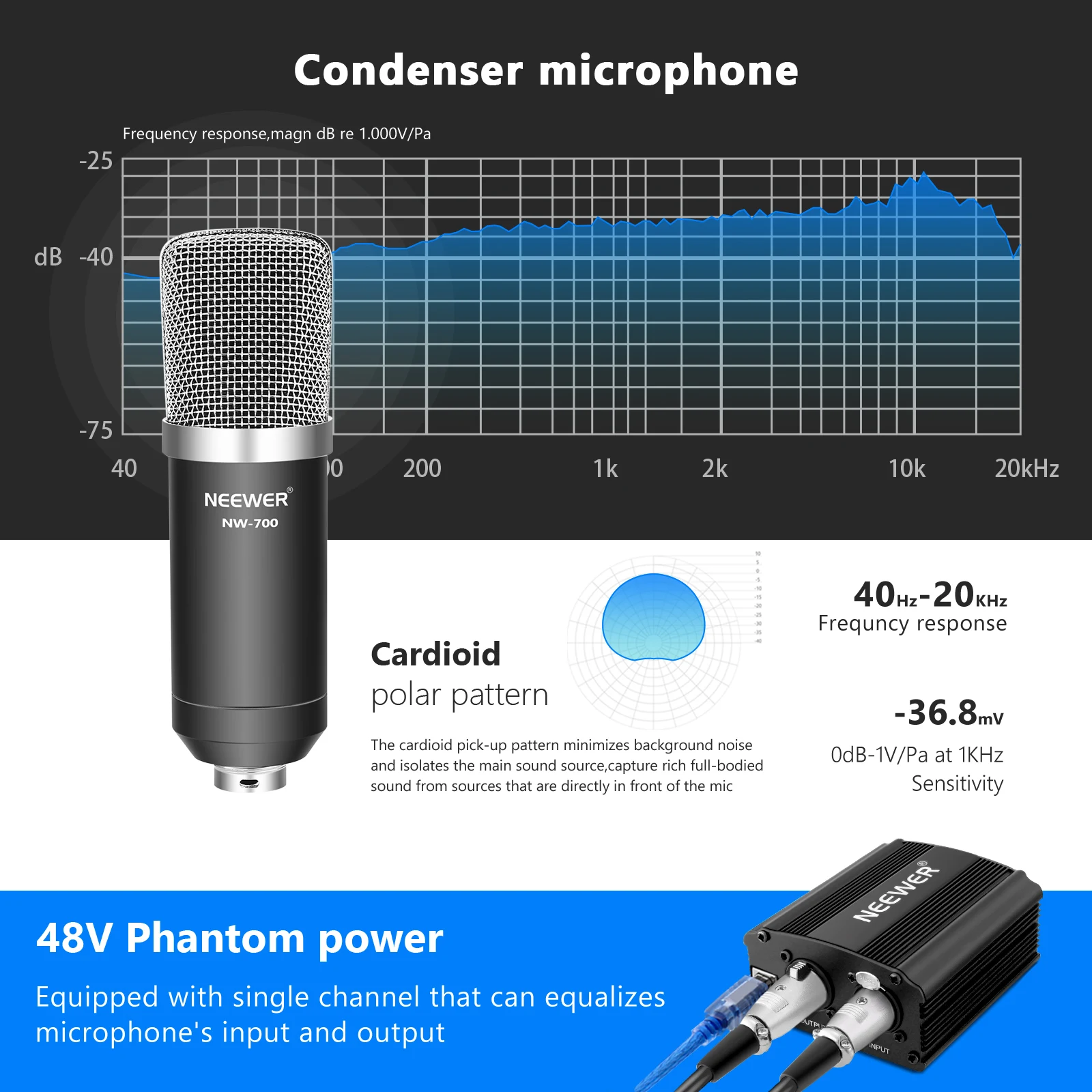 Neewer NW-700 конденсаторный микрофон комплект с USB 48 В Phantom Power Supply, NW-35 подвесной доводчник-стенд, поп-фильтр для домашней студийной записи трансляции YouTube Live перископа (черный)