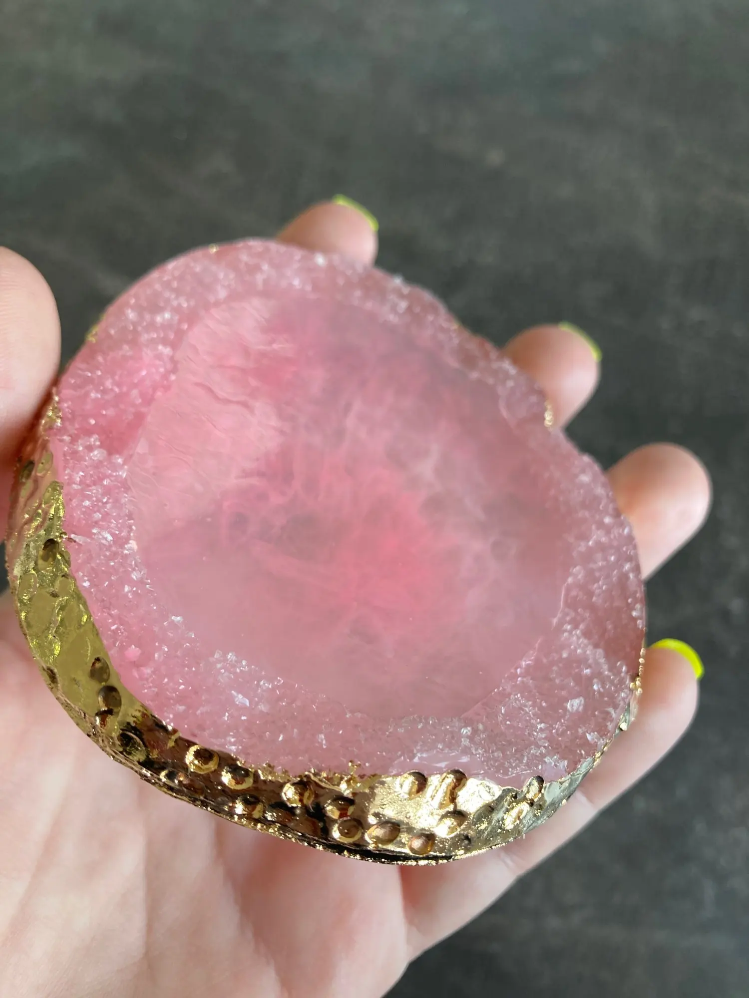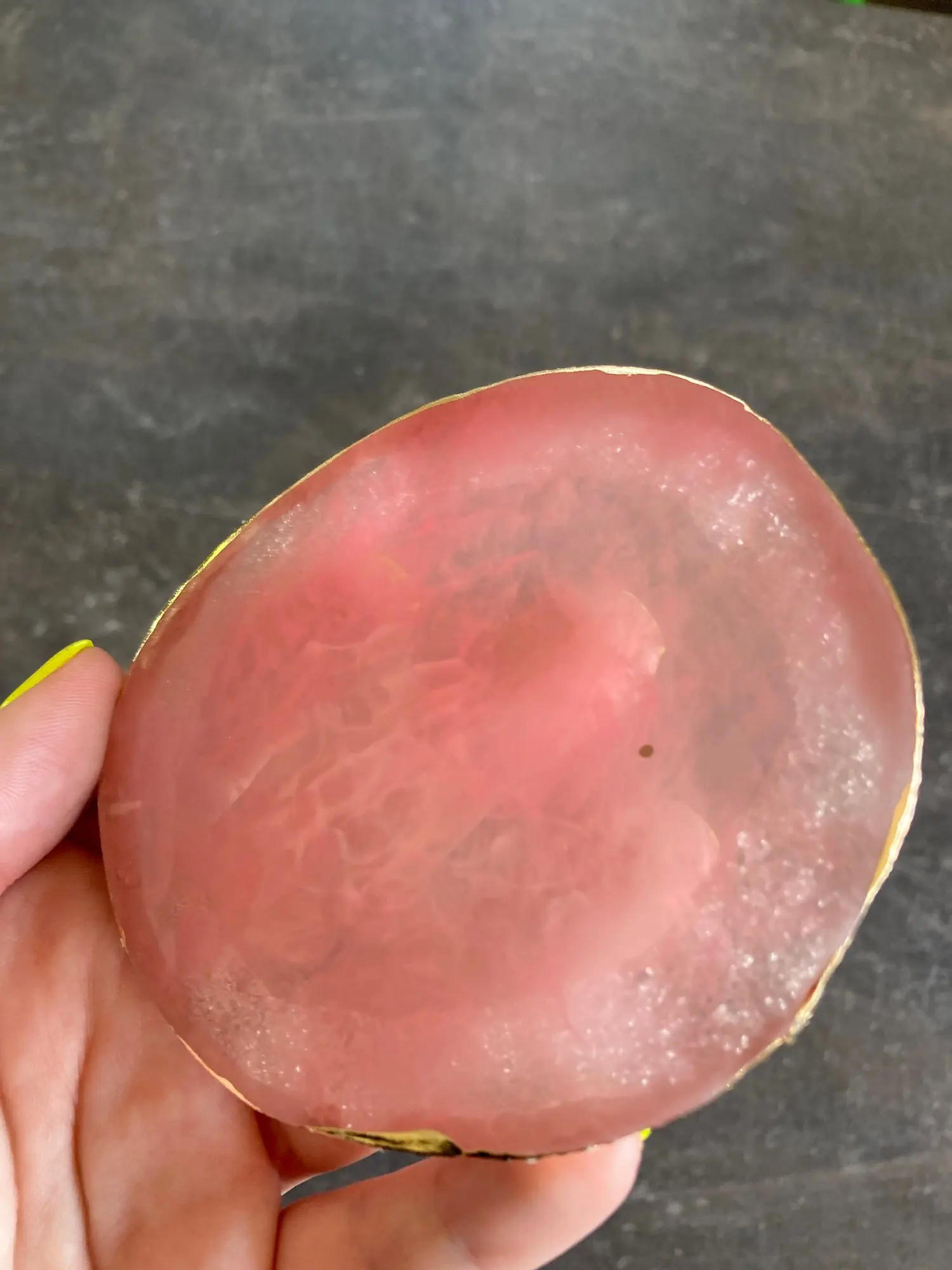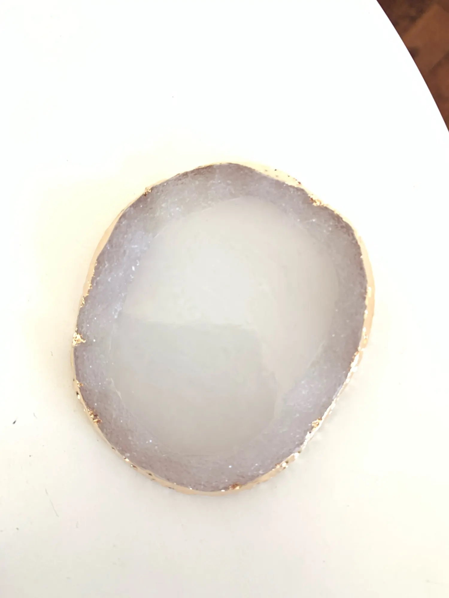 Я получил этот товар через месяц, он сделан из легкого пластика. Одна сторона имеет только кольцо с зубчатыми краями, как кристалл, а затем круг плоский посередине. Я думал, что это будут зазубренные края, смешанные с плоскими, но все равно было хорошо. Другая сторона была полностью плоской. Золото красивое и блестящее. Я думал, что он будет тяжелее, но я думаю, что он все еще в порядке и работает для смешивания цвета гель-лака, как я планировал.