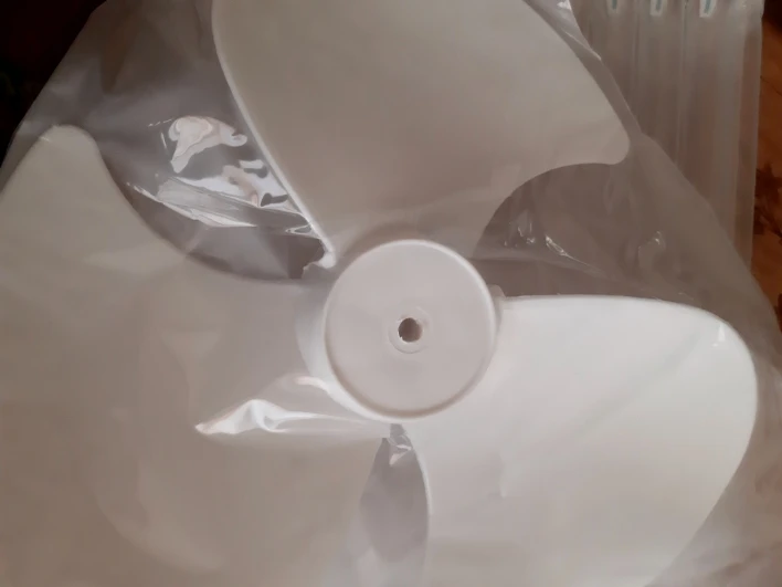 Пластик достаточно прочный. Работает несколько шумнее, чем сломавшиеся лопасти, но и поток воздуха сильнее, чем у прошлых лопастей. Упаковка хорошая: толстый слой воздушно-пузырьковой пленки. Подошел на старый вентилятор elenberg как влитой.
