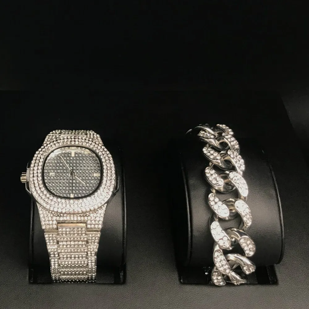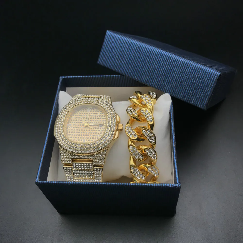 Каждый камень тщательно устанавливается вручную профессиональным ювелиром и создает полный вид со льдом. Уход за ювелирными изделиями: Пожалуйста, избегайте прямого контакта с водой, потоотделение и химическими веществами, такими как духи, моющее средство и лосьон. Чрезмерный светильник, тепло или влага, что ухудшит качество покрытия на металле. Кроме того, нанесение покрытых ювелирных изделий жидкостям приведет к потере покрытия. Пожалуйста, позаботьтесь о том, чтобы защитить ваши украшения, как у вас будет большинство ювелирных изделий Характеристики часов: Отображение календаря. Стекло с циферблатом, износостойкий, устойчивый к царапинам, ударопрочный и хорошо пропускает светильник. Характеристики: Тип изделия: кварцевые наручные часы Материал корпуса: нержавеющая сталь материал окна циферблата: стеклянный ремешок для часов Материал: нержавеющая сталь Тип застежки: складная застежка с безопасной Форма чехла: круглая Размер: Диаметр корпуса: 43 мм Толщина корпуса: 11 мм Ширина ремешка: 24 мм Длина ремешка: 22 см Цвет: Золотой/Серебряный Chian:8 дюймов Тип костюма 1: Посылка: 1 x часы 1 x коробка Тип костюма 2: Посылка: 1 x мужские часы 1 x коробка 1 x цепь