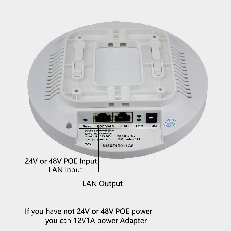 Если вы покупаете потолочный AP 24 В/48 В, но вы не приобрели Переключатель POE, вы можете использовать адаптер постоянного тока 12 В 1 А для питания