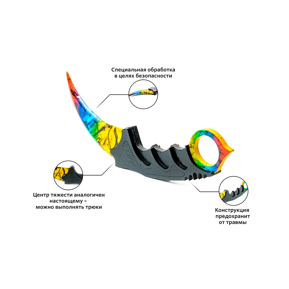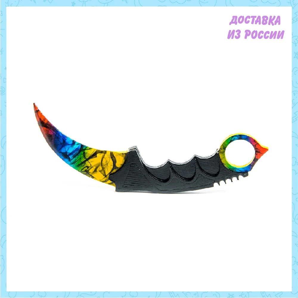 Керамбит с мраморным лезвием Как нравится мальчишкам играть в компьютерные игры, особенно в Counter-Strike, ведь именно эта видеоигра помогает им почувствовать себя мужественными солдатами, ведущими свою команду к победе. А чтобы перенести это ощущение из виртуального пространства игры в реальный мир, предлагаем Вам этот нож-керамбит из КС, который знаком каждому её поклоннику. Этот ножик – довольно редкий, и приобрести его непросто, поэтому он настолько ценен. Керамбит имеет закруглённое лезвие, называемое «коготь тигра». Оно окрашено в яркие цвета, которые градиентом переходят друг в друга, и имеет текстуру мрамора. Нож интересен также тем, что его держат обратным хватом. О таком подарке мечтает каждый! Яркий цветной нож-керамбит из дерева станет отличным подарком для любого фаната популярной CS-GO.