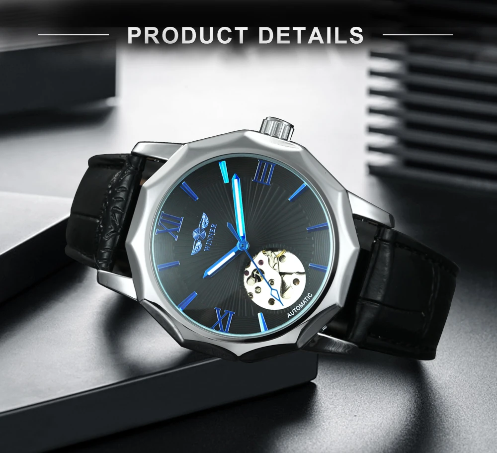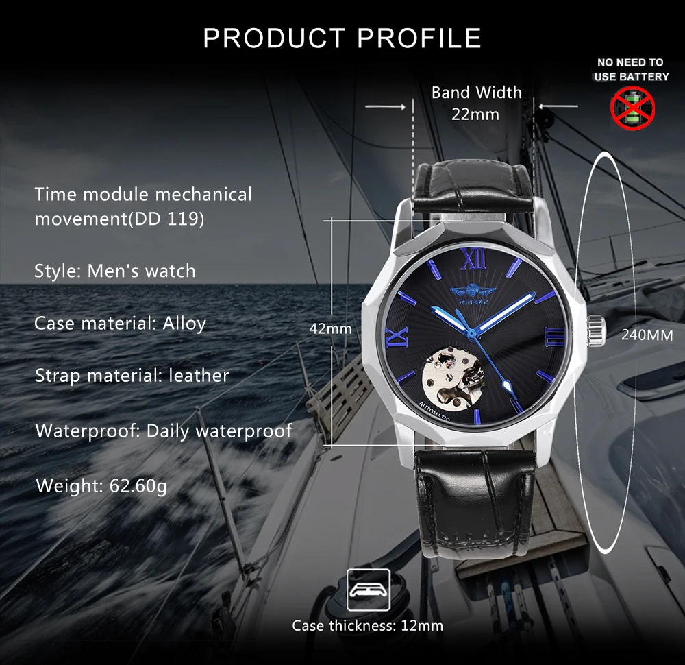 T-WINNER новые модные мужские часыБренд: WINNER( T-WINNER)Стиль: Модный, Повседневный, деловой, роскошный, спортивныйОсновная особенность:1. Часы с креативным дизайном, модный Повседневный стиль2. Новые модные часы с кожаным ремешком.3. 12-месячная гарантия на движениеХарактеристики:-Диаметр циферблата: 42 мм-Толщина чехла: 12 мм-Длина часов: 240 мм-Ширина ремешка: 22 мм-Вес часов: 62,6 г-Механизм: автоматический самоветер-Механический (батарея не требуется)-Материал зеркала: Hardlex-Тип застежки: Пряжка-Функция: светящиеся руки-Водонепроницаемость: ежедневная Водонепроницаемость (не для плавания или душа)Подходящий Случай:Идеально подходит для любых случаев и мероприятий вечерние, юбилеев, деловых встреч, повседневных занятий спортом на открытом воздухе, занятий в помещении или повседневного использованияПосылка входит:1 x часы (подарочные коробки опционально)