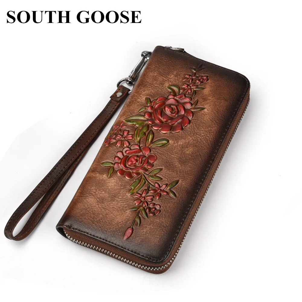 Модный женский кошелек SOUTH GOOSE из натуральной кожи, роскошный длинный клатч, удобная сумка с цветочным принтом, Женский кошелек для карт, зажимы для денег
