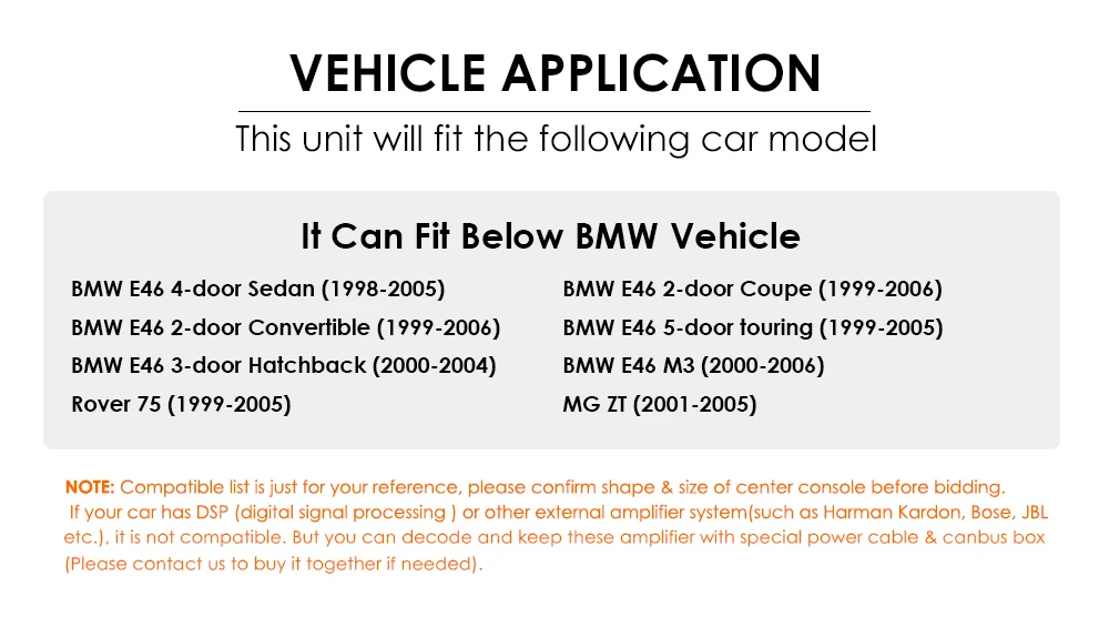 Мы покажем Два типа изображений списка BMW E46 Здесь один за другим, пожалуйста, проверьте перед подачей заявки. ( Первый для android 10 9 дюймов BMW E46 с 4 G RAM + 64G ROM (задний размер-153 мм * 180 мм * 50 мм), который показан в первом списке; Последний из них для Android 10 9 дюймов BMW E46 с 2 G RAM + 16G ROM (размер задней части-153 мм * 180 мм * 50 мм), который показывает один средний список фотографий; Будет следовать за ним. Спасибо за внимание перед подачей заявки.