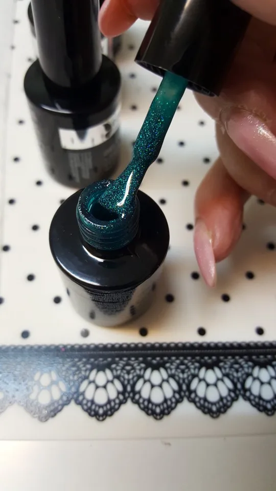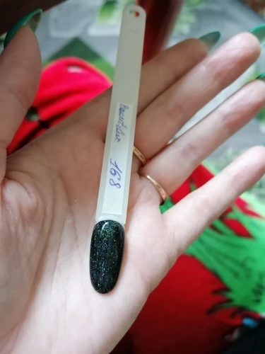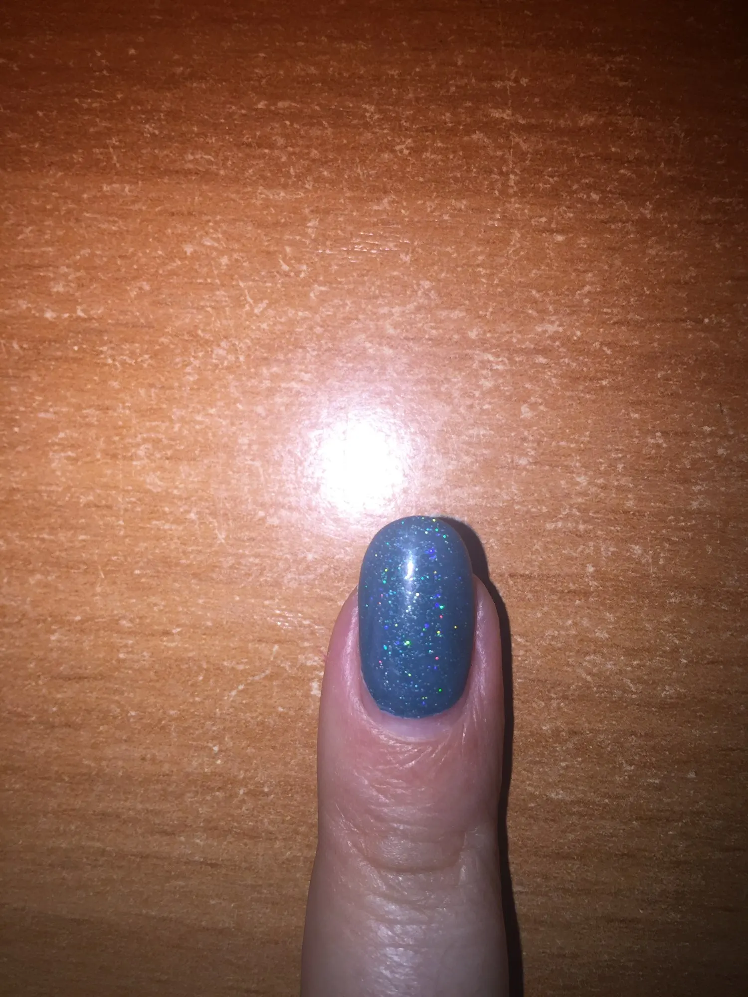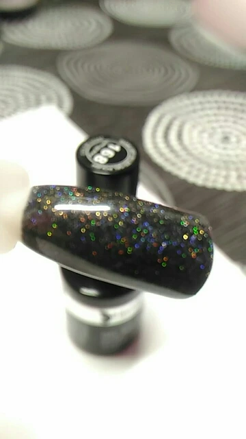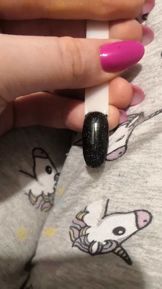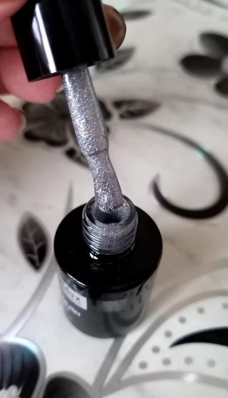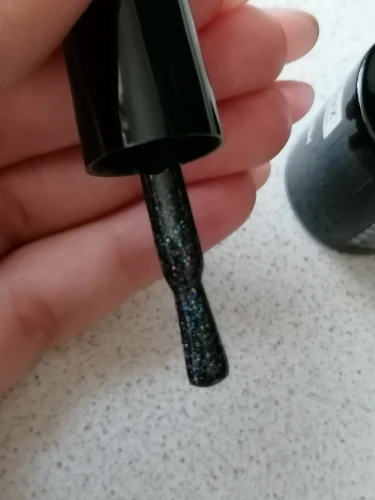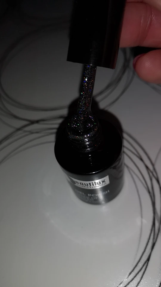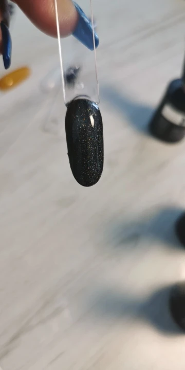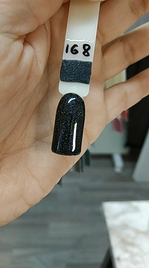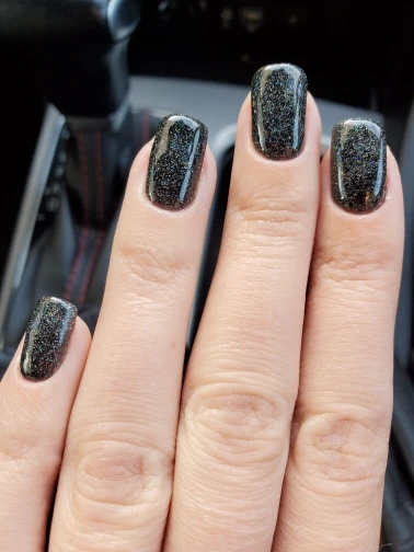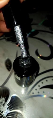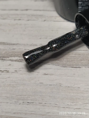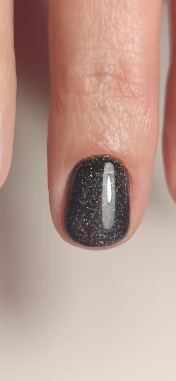 Шёл до Кемеровской области почти 2 месяца. Основа чёрно-графитовая плотная, шиммер мелкий голографический в большом количестве. Наносится легко, саморазравнивается, не течёт. В один средний слой без проблем. Красивый) Ждала к новому году)