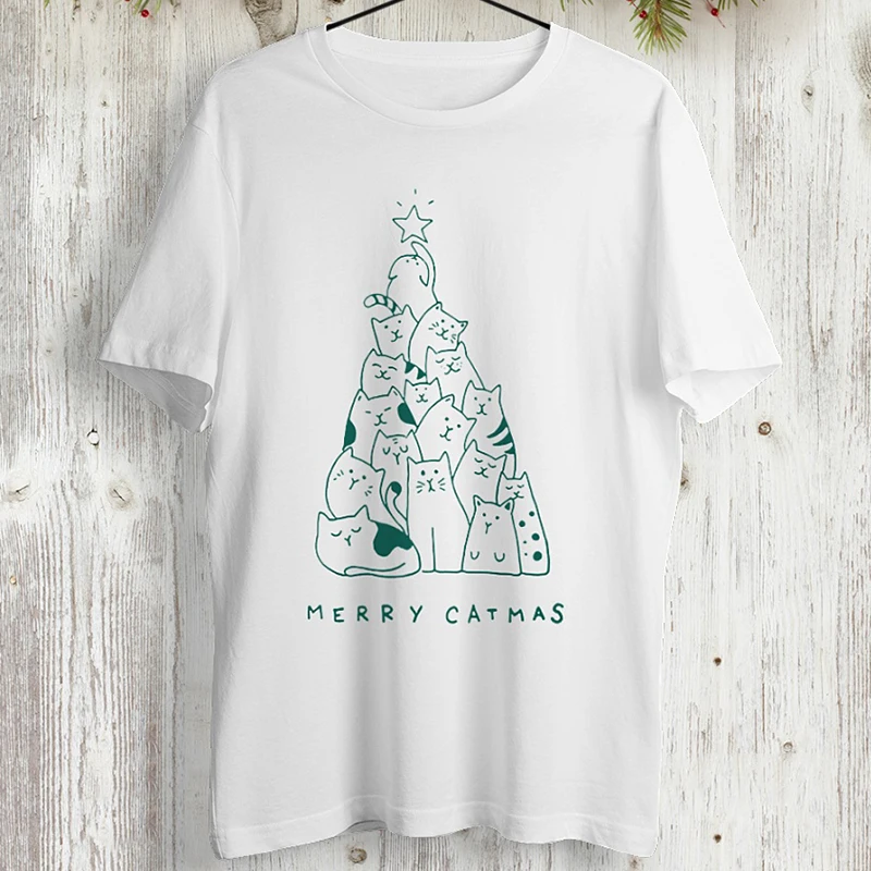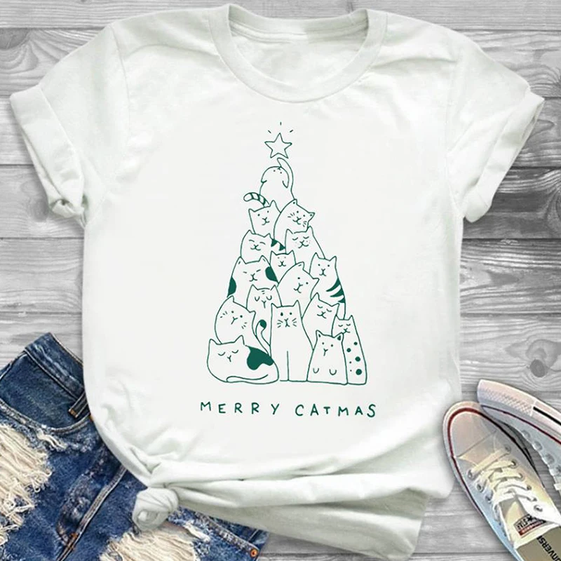 Merry Catmas Футболка женская футболка с принтом Счастливого Рождества топы с короткими рукавами Hello Kitty с рождественской елкой, хлопковая верхняя одежда футболки для девочек