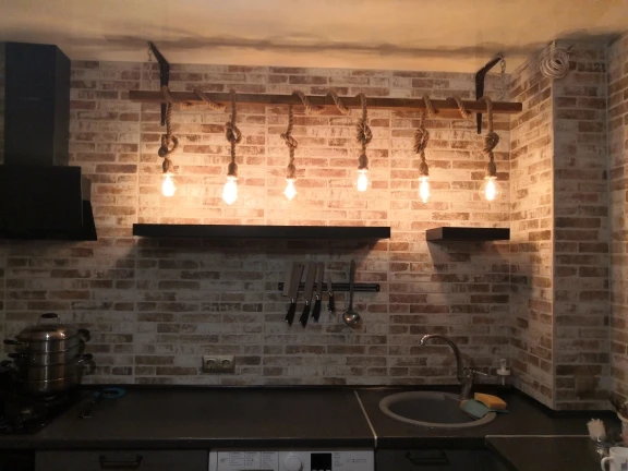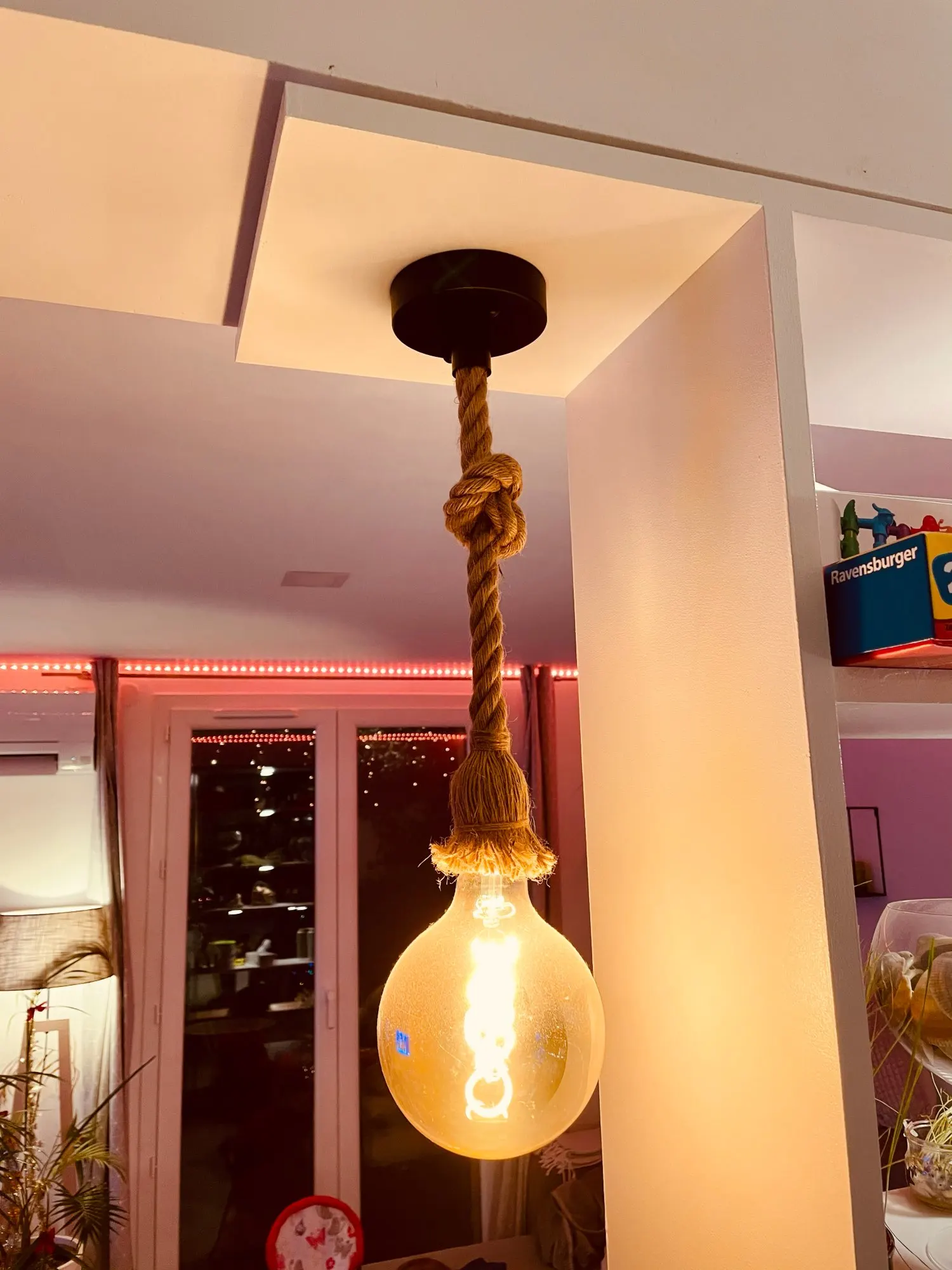 отличный светильник. метр длиной оказался достаточным для того чтобы завязать фактурный узел и смотрелся гармонично в комнате с высотой потолков 2,8 м