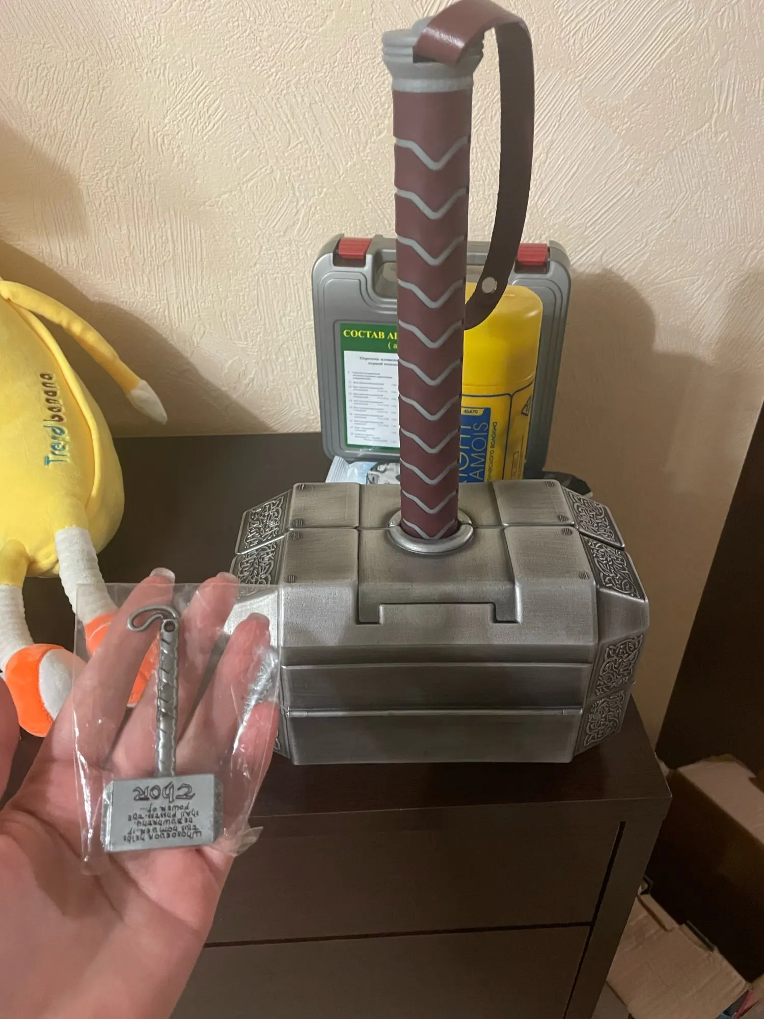 К содержимому товара вопросов нет. Проблема исключительно в транспортировке заказа, в последствии чего кейс молота был повреждён при транспортировке. Рекомендую поставщику выполнять отправку данного молота в разобранном виде, чтобы молоток который в центре не ломал саму конструкцию, так как при нахождении его внутри кейса при любом приложенном давлении на рукоять молотка, он давит на пластиковый корпус в центре и ломает его изнутри. Исходя из всего этого подарить такой предмет уже не является возможным.