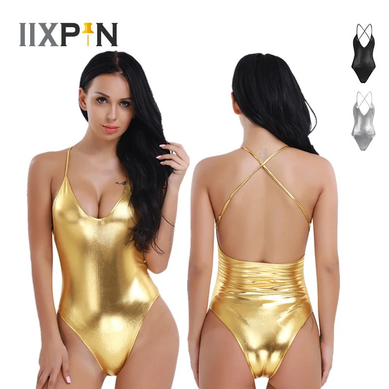 # S-XL для женщин и взрослых, лакированная кожа, тонкие лямки, Глубокий V-образный вырез, цельные стринги, монокини, облегающее танцевальное трико