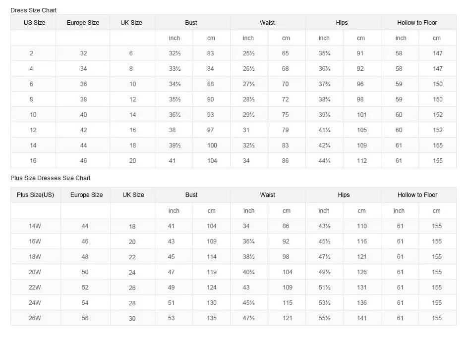 Мы настоятельно рекомендуем, чтобы ваши измерения были сделаны профессионалом с вашей одеждой перед покупкойПлатье