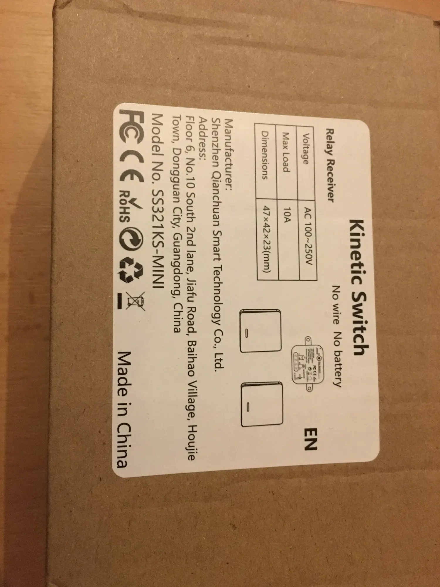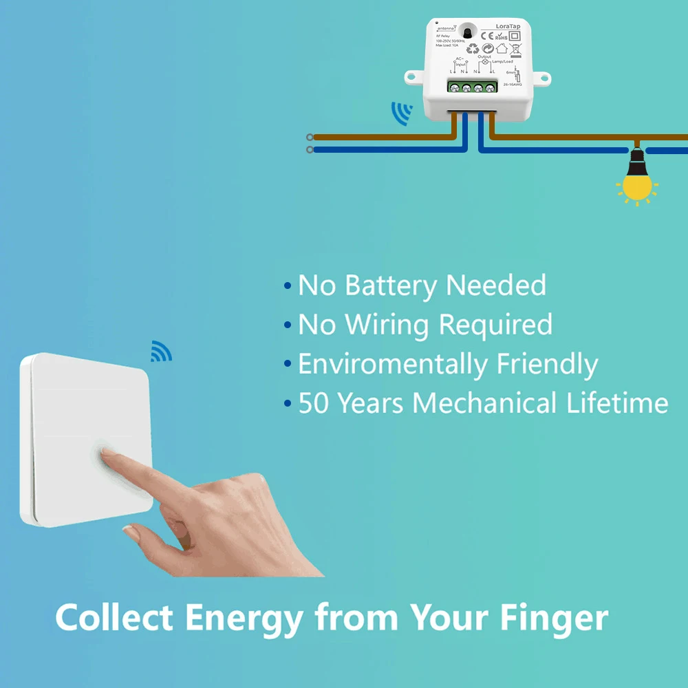 Передатчик (пульт дистанционного управления)Размеры: 86*86*15 ммРадиус действия: до 30 метров в помещении, до 100 метров на улице (без препятствий)Радиочастота: 433 МГц, высокая безопасность с помощью программы самообученияПродолжительность: более 220,000 нажатийТип батареи: выключатель без питания срабатывает при нажатии энергии движенияРелейный ресиверВходное напряжение: 100 -250 В переменного тока, 50 /60 ГцВыходное напряжение: 100 -250 В переменного тока, 50 /60 ГцМаксимальная нагрузка: 10 АМаксимальная мощность: для энергосберегающих ламп, таких как LED, люминесцентная лампа мощностью до 300 Вт (10А); Для лампы накаливания, вольфрамовой лампы, галогенная лампа мощностью до 2500 Вт (10 а); Для другого электрооборудования мощностью до 2500 Вт (10 А).Примечание: эта система не может быть совместима с продуктами WLAN, такими как Amazon Alexa, Google Home и Apple Homekit. Это всего лишь набор беспроводных переключателей RF.