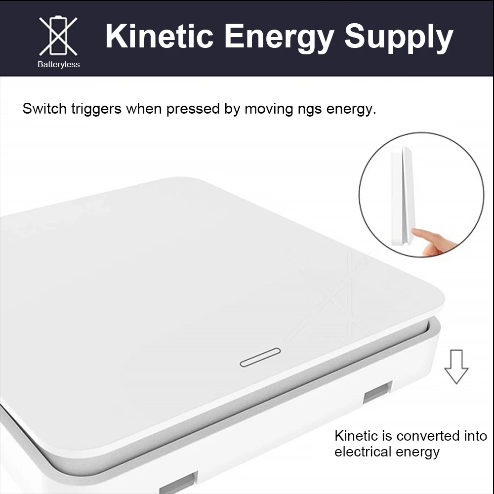 -Удобно Управляйте освещением с помощью радио без кабелей и батареек.-Вы не хотите приложение? -Здесь вы правы.-Простая установка с помощью ленты или винтов-также на стене 30 -100 м-Не требуется Аккумулятор для кинетического беспроводного переключателя, он Автономный.