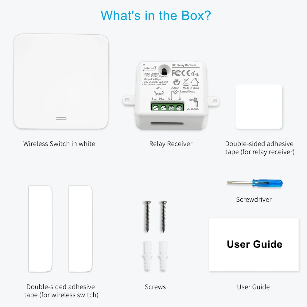 1 x пульт дистанционного управления в белом цвете1 х релейный ресивер1 х Руководство пользователя (на английском языке)1 х ОтверткаВинты-2 шт.2 х Двухсторонняя клейкая лента