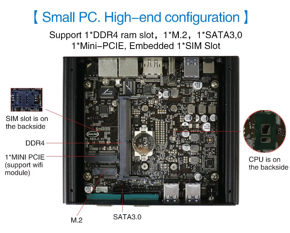 Поддержка 1 * Mini-PCIE(Wifi/3G/4G опционально), Встроенный слот SIM на задней панели